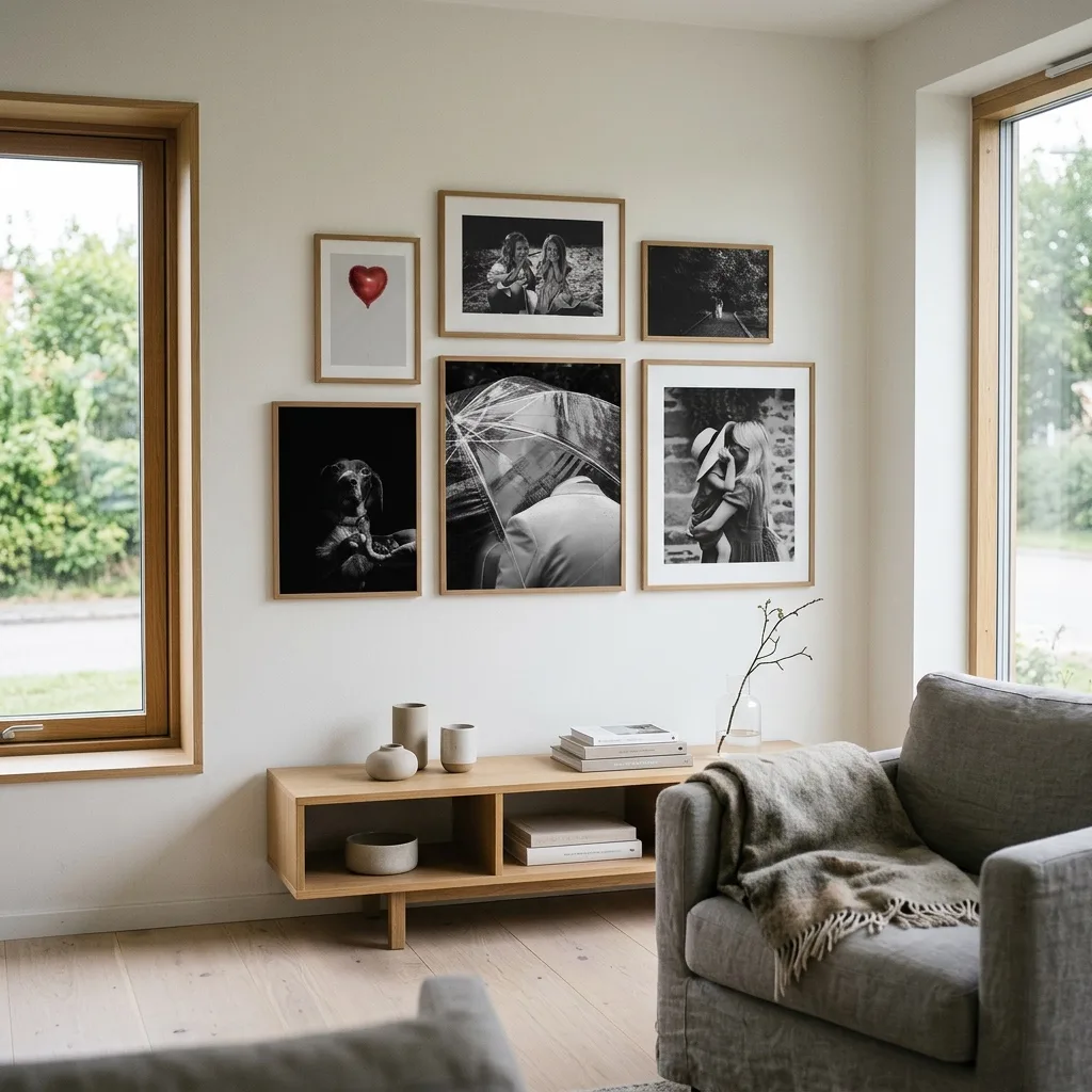 I praksis anbefaler vi ofte at gå en størrelse op og arbejde med passepartout eller hvid kant. Det giver mere ro omkring motivet og får billedet til at fremstå mere færdigt på væggen.