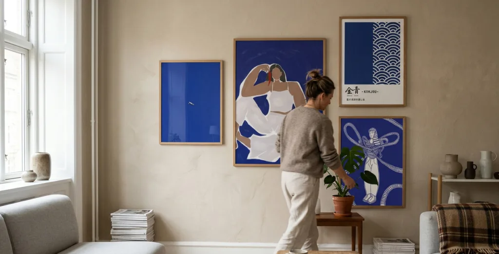 Men det afhænger meget af, hvad plakaten hænger sammen med. Blå fungerer bedst, når der er noget, der balancerer den – typisk varme materialer som træ, tekstiler eller beige nuancer. Uden det kan udtrykket hurtigt blive køligere, end man havde tænkt.