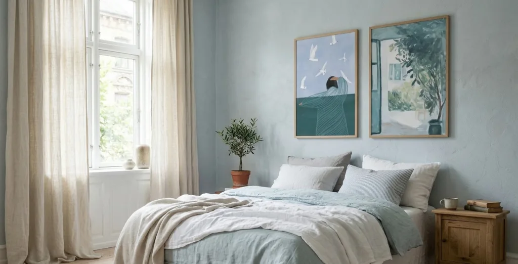 Ja, i de fleste tilfælde. Blå er en af de farver, der er nemmest at arbejde med, fordi den ikke dominerer rummet. Det vigtigste er at tilpasse nuance og motiv til rummet – ikke bare vælge efter farven alene.