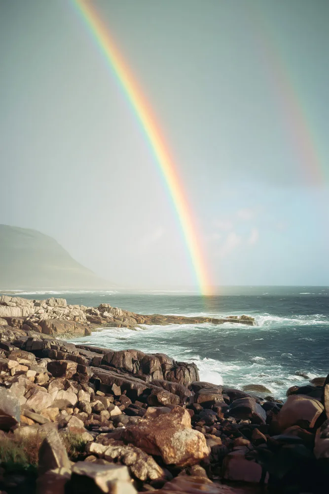 Et dramatisk landskab med dobbelte regnbuer over klipper og hav. Et naturligt motiv, der bringer ro og eftertænksomhed ind i hjemmet.