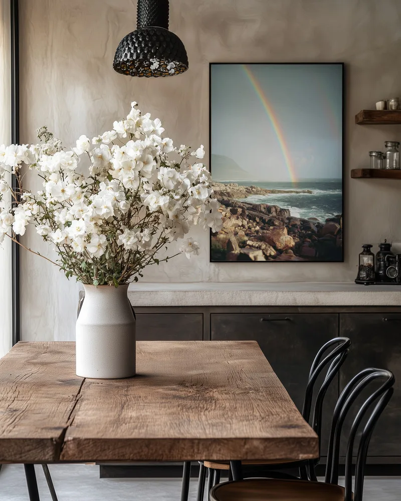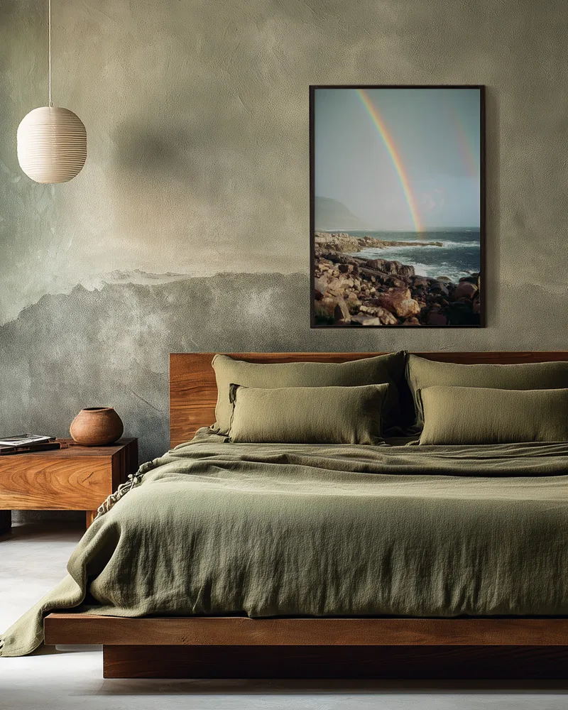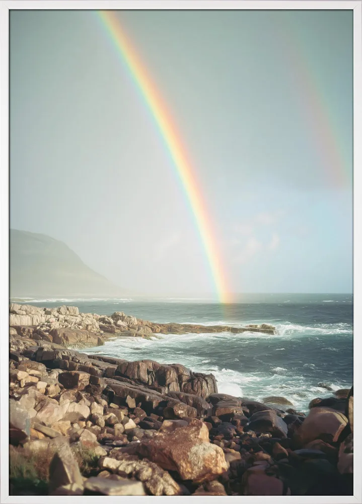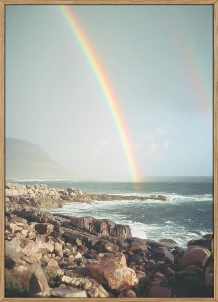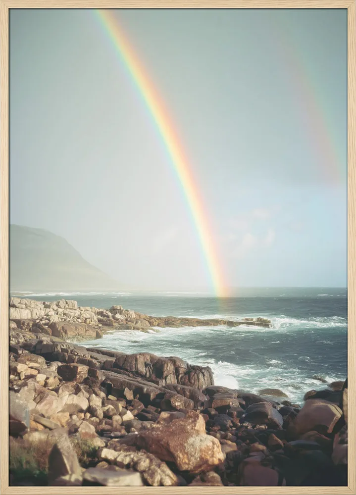 Et stemningsfuldt naturmotiv af Melloi, hvor dobbelte regnbuer bryder igennem en diset himmel over et klippelandskab. Farverne er afdæmpede og naturlige med fokus på kontrasten mellem havets blågrønne toner og himlens gyldne lys. Printet udstråler ro og harmoni og passer perfekt i stuen, soveværelset eller et kontor, hvor natur og ro skal spille hovedrollen. Et fotografisk kunstværk med sans for detaljer og dybde.