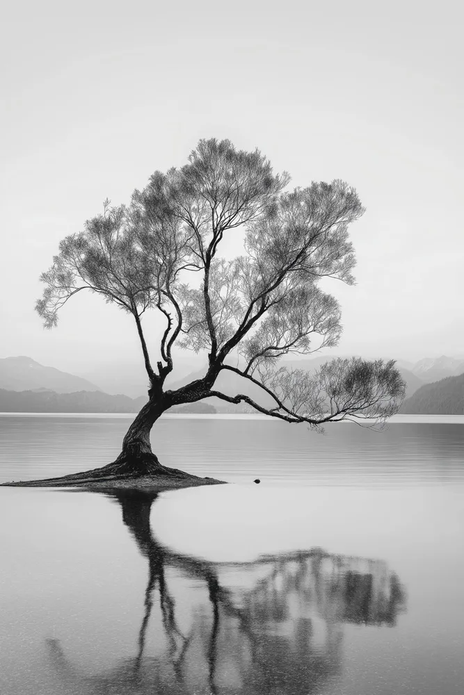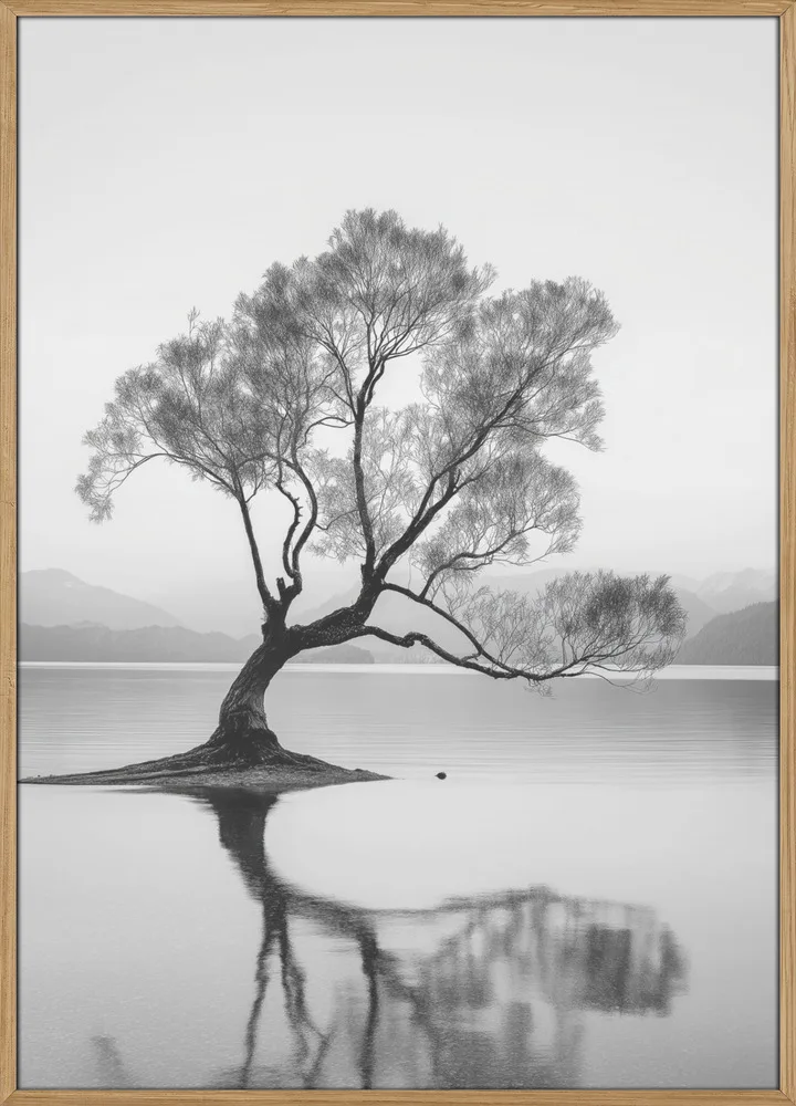 Et enkelt og roligt motiv af et ensomt træ i spejlblankt vand. Minimalistisk og tidløst.