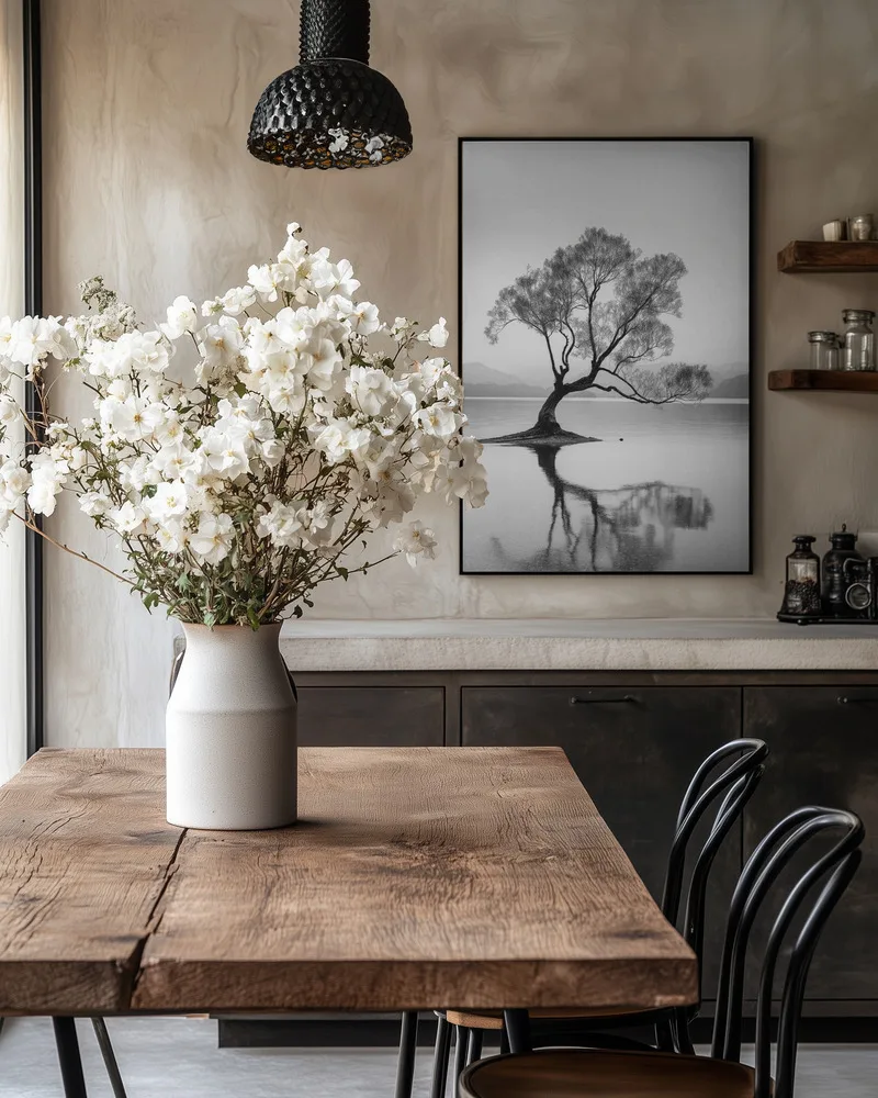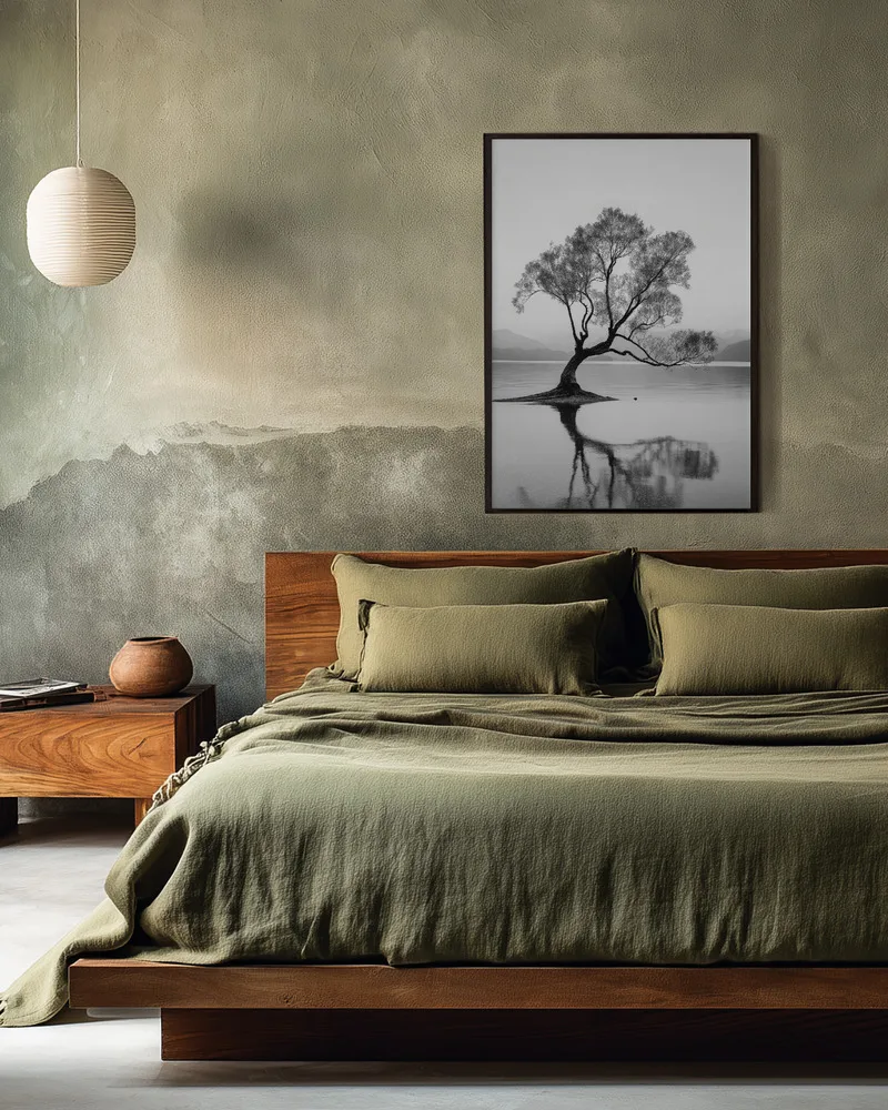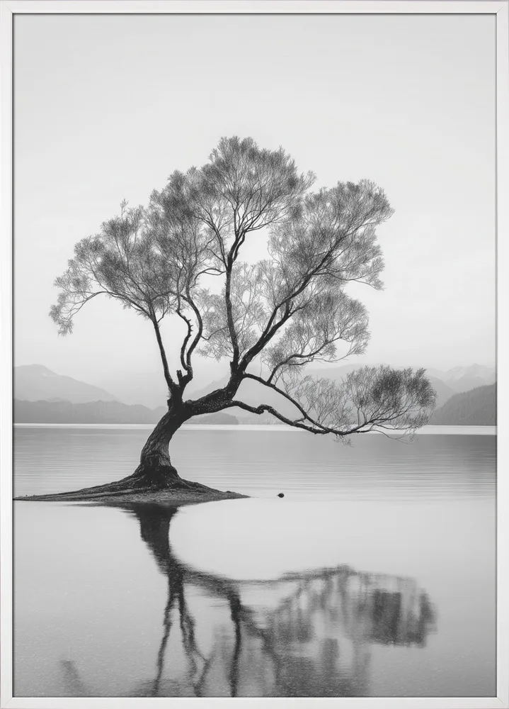 Et betagende fotografi af Melloi, der viser et enkelt træ, som står alene i spejlblankt vand. Farverne er holdt i sort, hvid og bløde gråtoner, hvilket giver motivet en minimalistisk og balanceret udstråling. Et billede, der skaber ro og passer perfekt i rum med nordisk, afdæmpet indretning – eksempelvis soveværelset, stuen eller entréen. Et ikonisk værk inden for moderne fotokunst.
