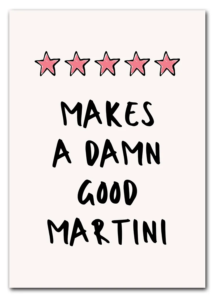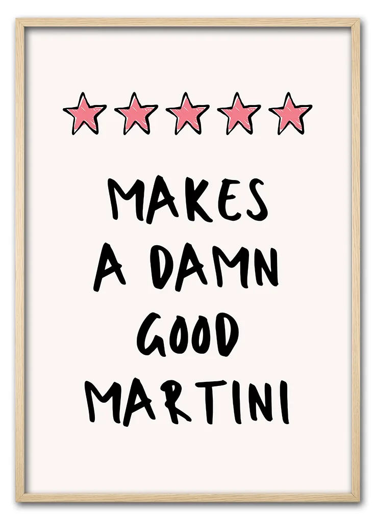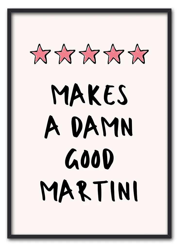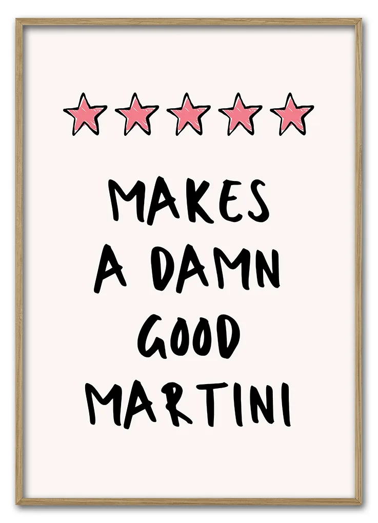 A Damn Good Martini er en humoristisk og grafisk enkel plakat med teksten ‘Makes a damn good martini’ skrevet i håndtegnet typografi. Fem røde stjerner over teksten giver et strejf af attitude og personlighed, mens den minimalistiske stil gør den let at kombinere med både kunst og fotografier. Baggrunden er helt hvid, hvilket lader budskabet stå tydeligt frem. Perfekt til barområdet, køkkenet eller som en gaveidé til cocktail-entusiasten med sans for stil og selvironi. Motivet passer godt ind i moderne og urbane hjem, og fungerer både alene og sammen med andre cocktail-relaterede plakater i en serie.
