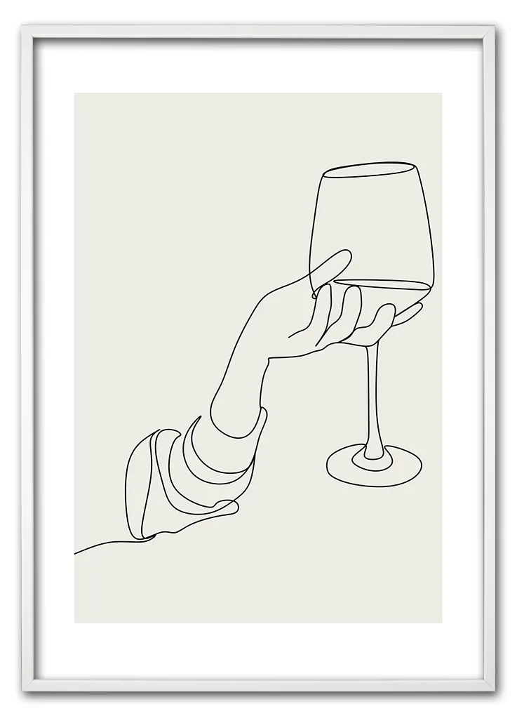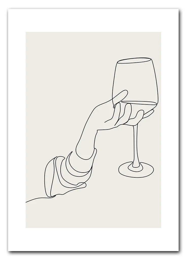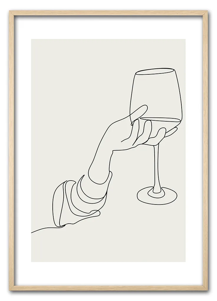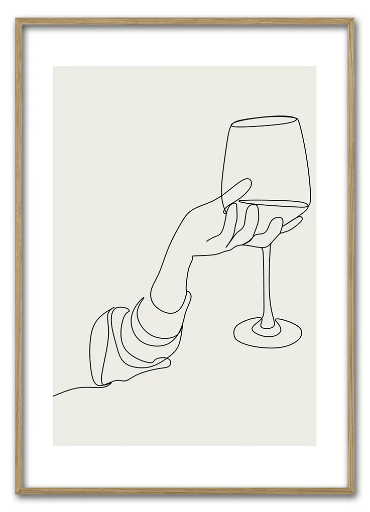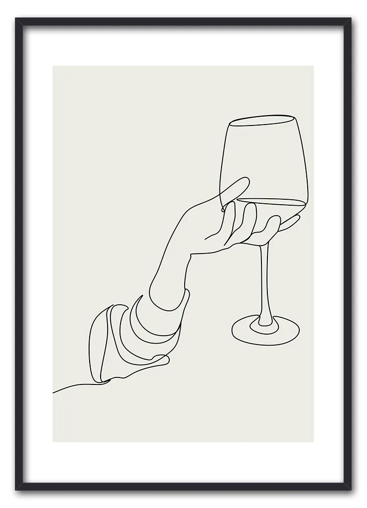 A Glass of Wine er et stilrent lineart-motiv, hvor en enkelt hånd holder et vinglas i en elegant skål. Stregen er enkel og sikker, hvilket skaber et tidløst og æstetisk udtryk. Plakaten er holdt i sort-hvid og fremstår let, moderne og diskret luksuriøs. Et perfekt valg til dig, der elsker vin og gerne vil udtrykke det med grafisk finesse. Hæng den i køkkenet, spisestuen eller vinkrogen for et elegant og personligt touch. Motivet passer godt til billedvægge, hvor man ønsker at tilføje et roligt og sofistikeret element.