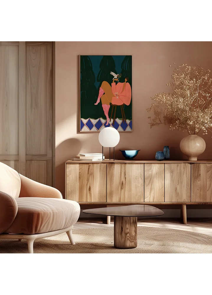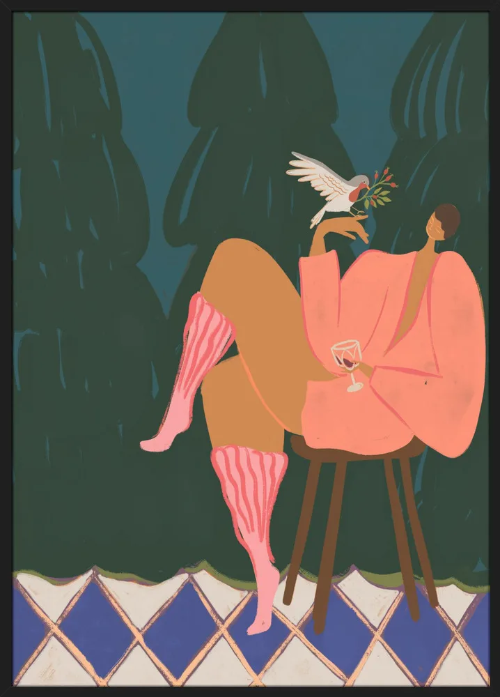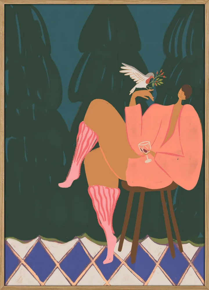 A Lil Birdy Told Me af Arty Guava er et moderne, farverigt og karakterfuldt portræt, der leger med mode, humor og afslappet attitude. Den centrale kvinde sidder nonchalant med et glas vin, mens en lille fugl hviler sig på hendes finger og tilføjer en både poetisk og legende dimension. De dybe farver – den mørke grønne baggrund, de varme røde toner og de lilla striber i hendes tøj – giver en stærk visuel dybde og gør motivet rigt og dramatisk. Arty Guava er kendt for sin evne til at kombinere modige farvevalg med varme, menneskelige udtryk, og dette værk er ingen undtagelse. Det er et oplagt motiv til moderne hjem, hvor personlighed og farver gerne må fylde, og hvor kunsten gerne må være mere end bare dekoration – den må gerne udtrykke stemning, identitet og attitude. Perfekt til stuen, kontoret eller et kreativt arbejderum, hvor det kan bringe energi og karakter. A Lil Birdy Told Me fungerer både som solomotiv eller som del af en farverig kunstvæg, hvor dens stærke udtryk kan binde forskellige elementer sammen.