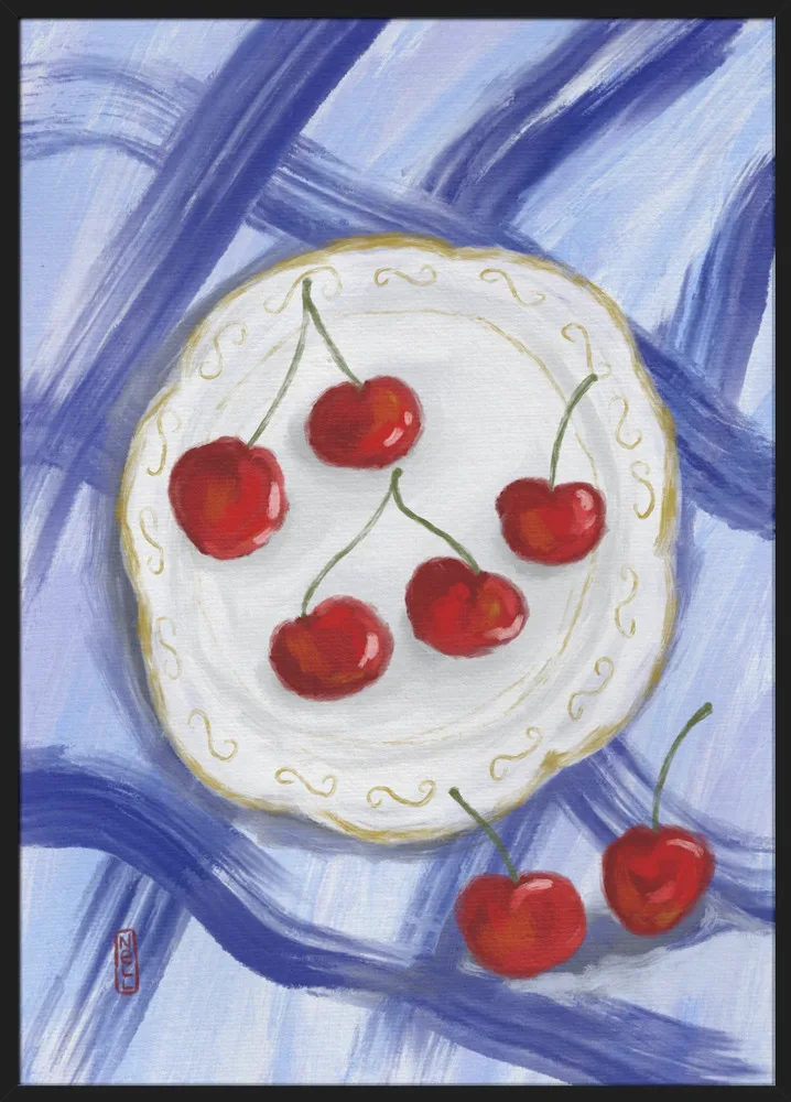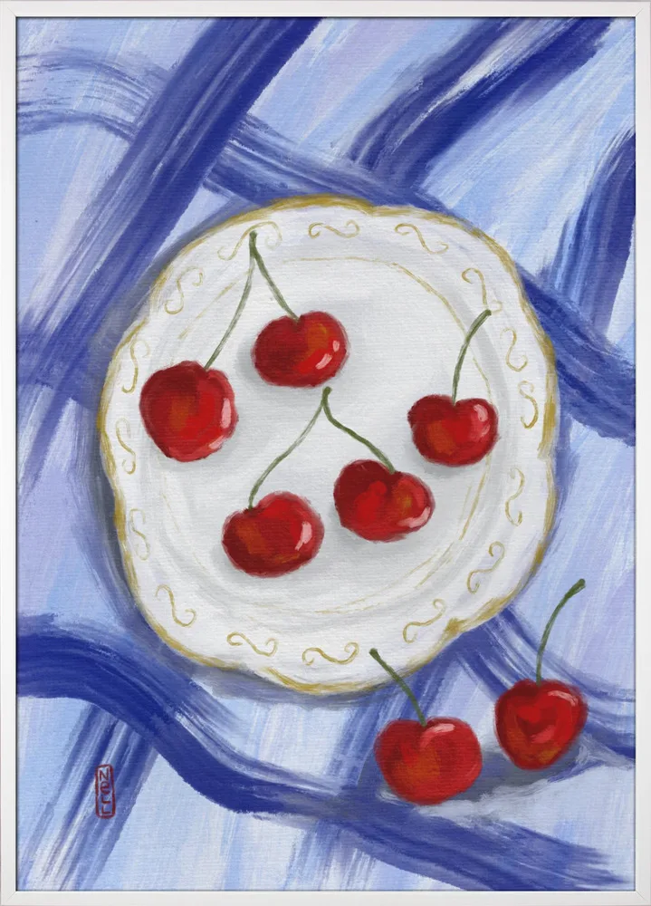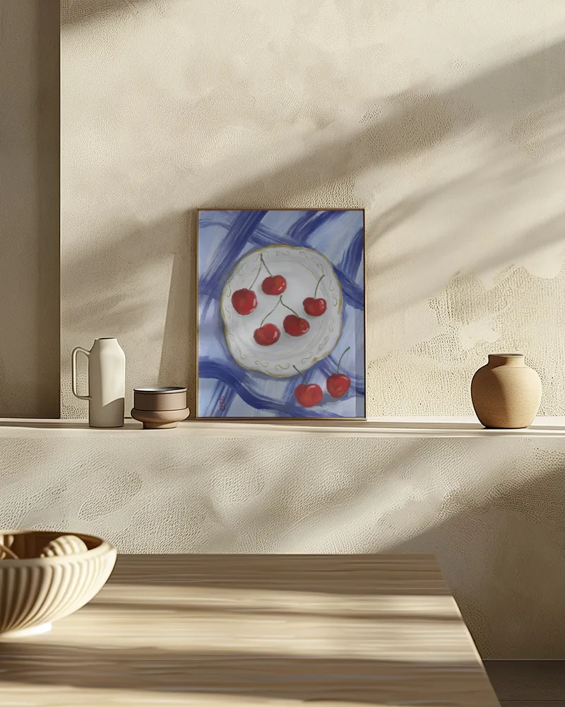 A Plate of Cherries af kunstneren ses som en hyldest til enkel nydelse og farverig æstetik. Motivet viser modne røde kirsebær lagt på en lys tallerken, fanget i en rolig og velafbalanceret komposition. De dybe røde toner står smukt mod den bløde baggrund og skaber et elegant, næsten minimalistisk udtryk. Plakaten tilfører varme og liv til køkkenet, spisestuen eller endda stuen, hvor farverne kan give en frisk kontrast til neutrale omgivelser. Stilen er enkel, moderne og tidløs – perfekt til dem, der ønsker et naturligt, men sofistikeret udtryk på væggen.
