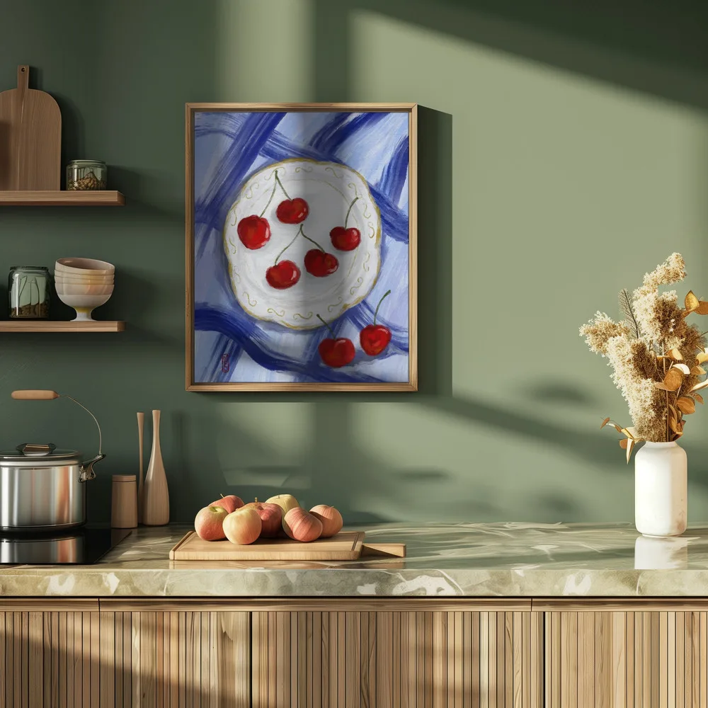 En frisk og livlig plakat med saftige røde kirsebær på en lys baggrund. Perfekt til køkkenet eller spisestuen for et strejf af naturlig sødme.