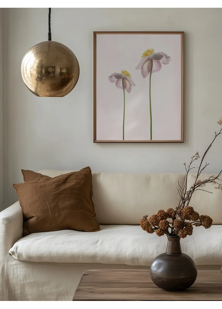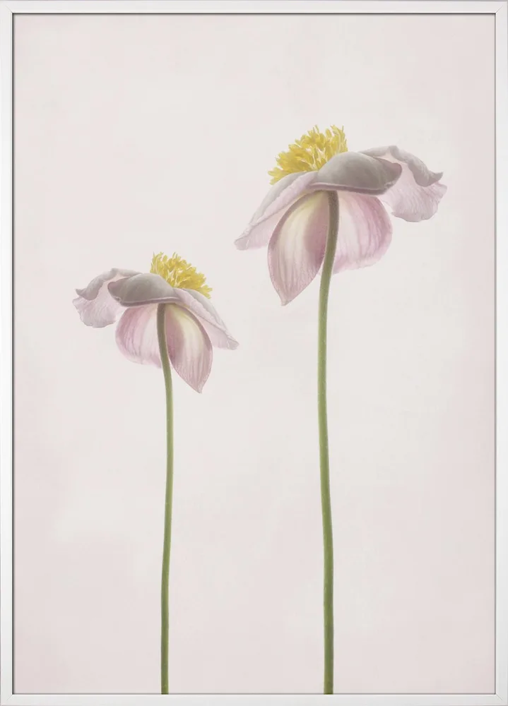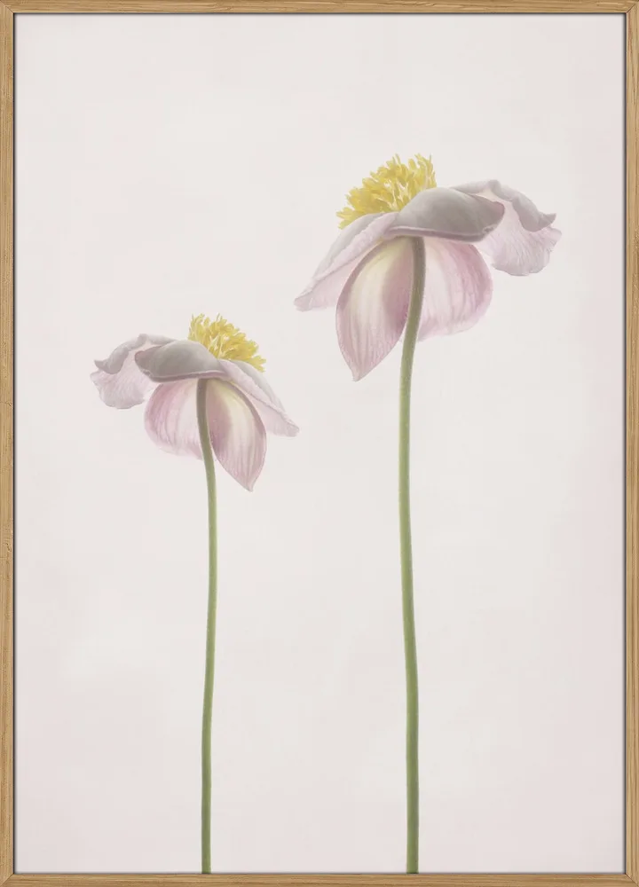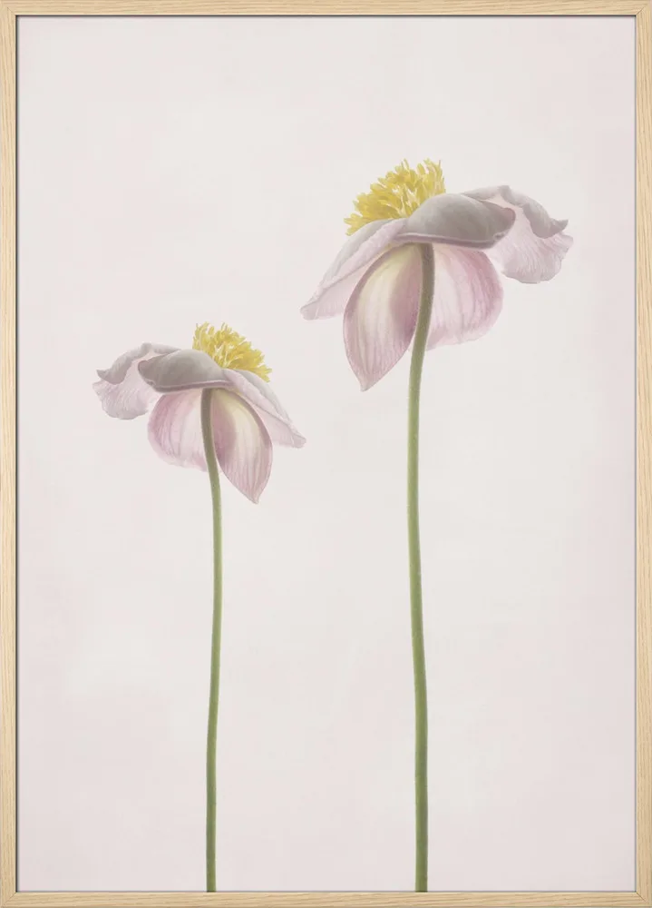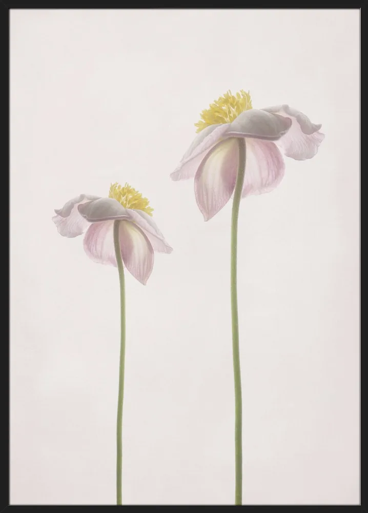 Et lyst og sommerligt blomsterportræt med to sarte blomster i lyserøde og grønne nuancer. Det enkle motiv skaber en følelse af ro, varme og lethed. En plakat, der fungerer smukt i soveværelse, stue eller et kreativt hjørne, hvor du ønsker en blid og naturlig stemning.