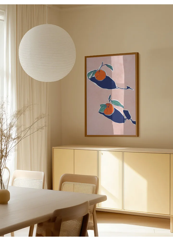 Farverig plakat med to stiliserede appelsiner på lyserød baggrund. Et frisk og legende motiv med kunstnerisk charme.