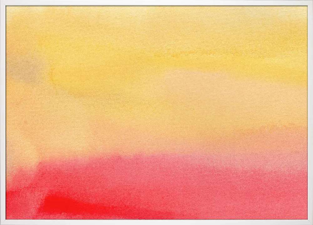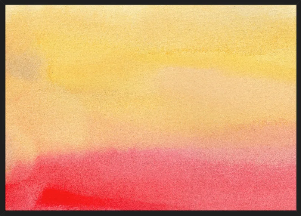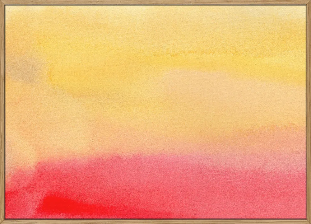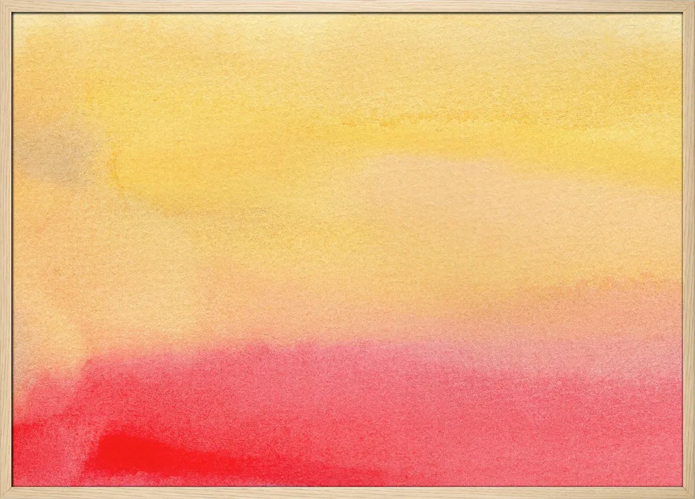Abstract Watercolor 11 af Dina Dankers er et smukt, blødt akvarelmotiv, der forener varme farver og rolig bevægelse. Den glidende overgang mellem solgul, koralrød og varme rosa nuancer skaber et udtryk af varme og balance, der næsten føles meditativt. Akvarelteknikken giver værket en organisk lethed, hvor farven flyder frit og naturligt, og hvor hvert lag tilføjer dybde og tekstur.