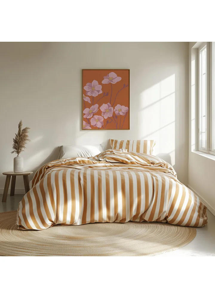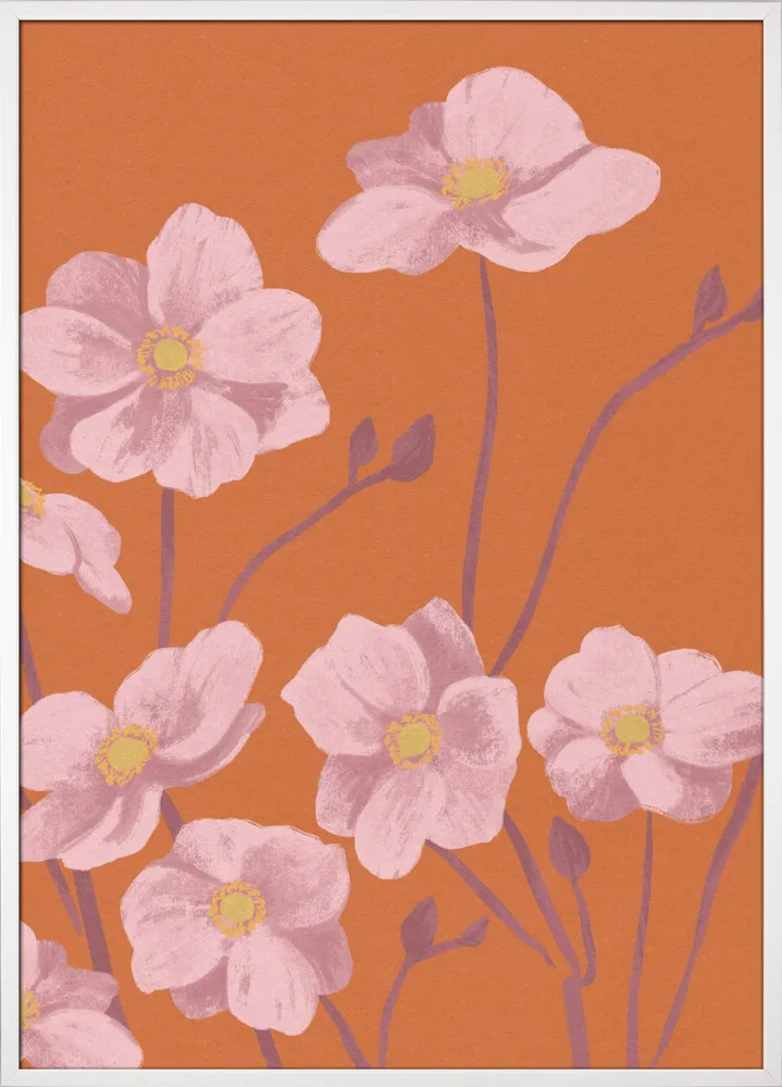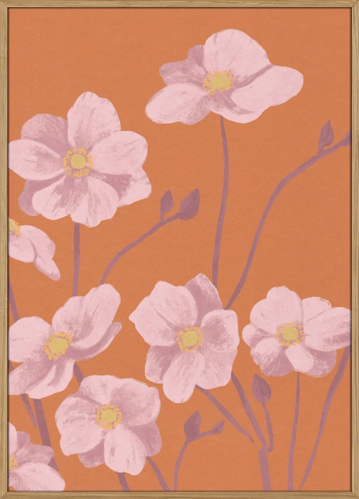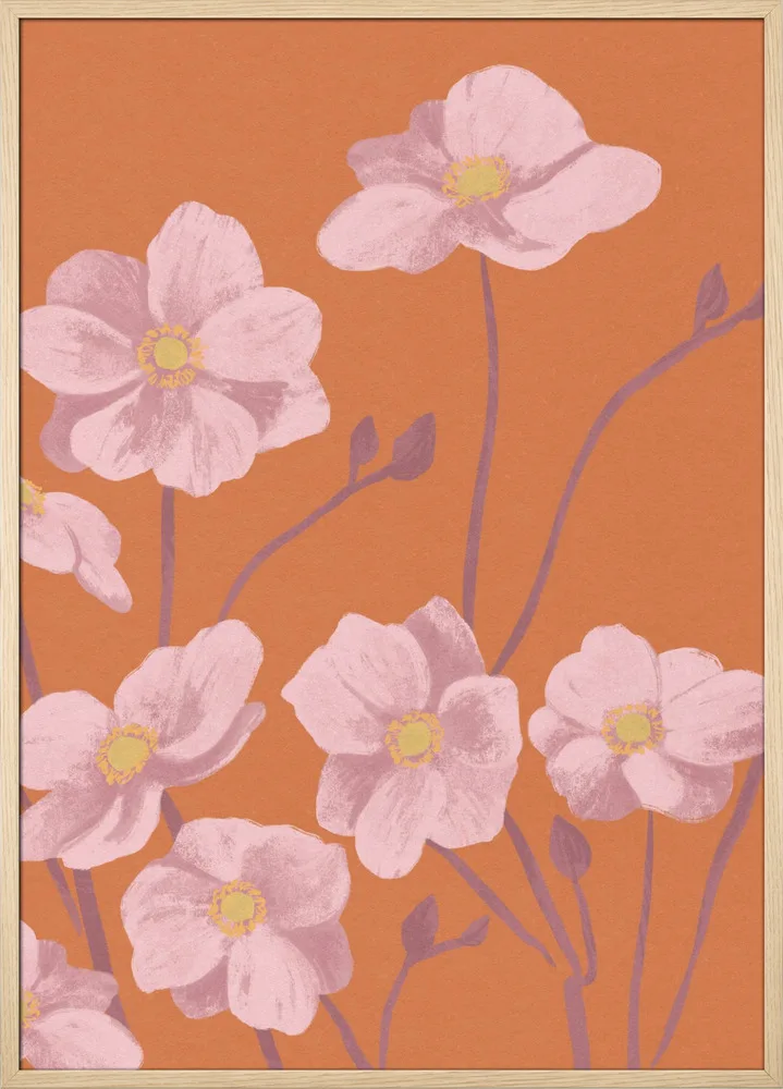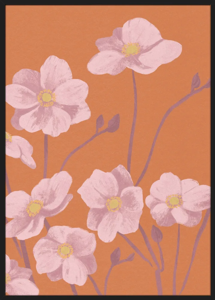En varm og blød blomsterillustration med lyserøde anemoner på en dyb orange baggrund. Motivet er let, feminint og dekorativt og giver et roligt udtryk til rummet. Farverne spiller elegant sammen og skaber en naturlig varme, der gør plakaten velegnet til både stue og soveværelse.