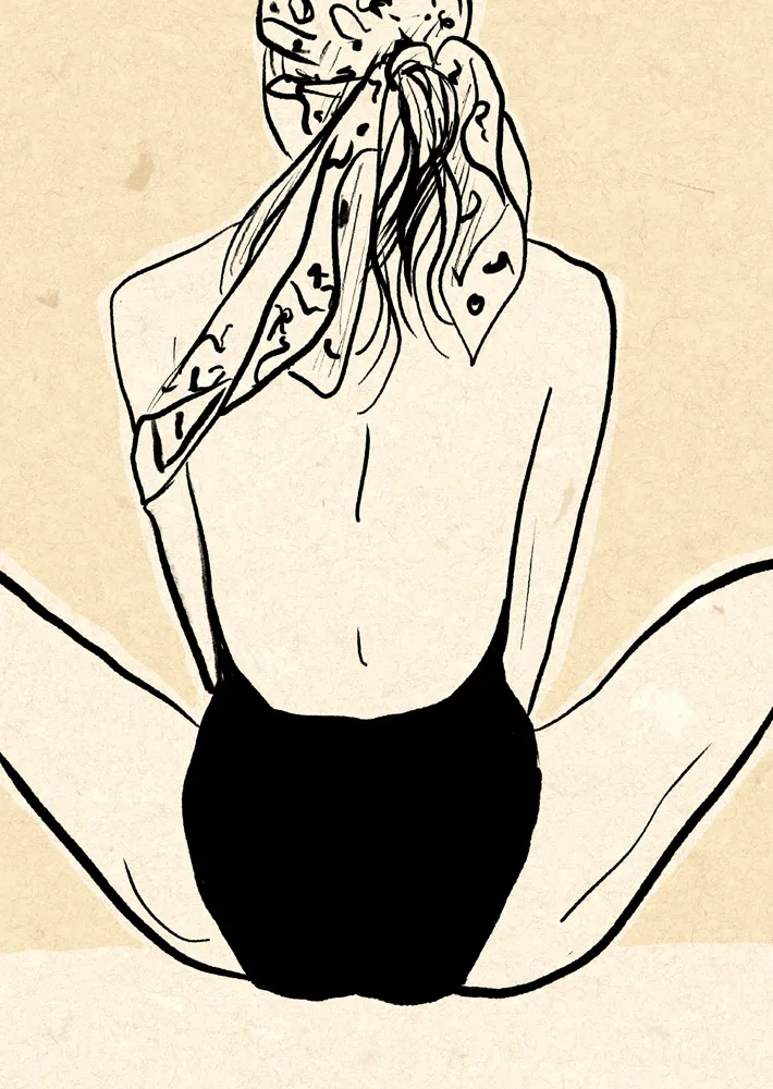 Sort-hvid plakat af en kvinde med ryggen til, siddende ved stranden. Enkel og elegant linjetegning.