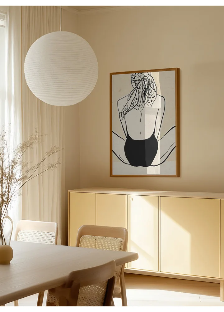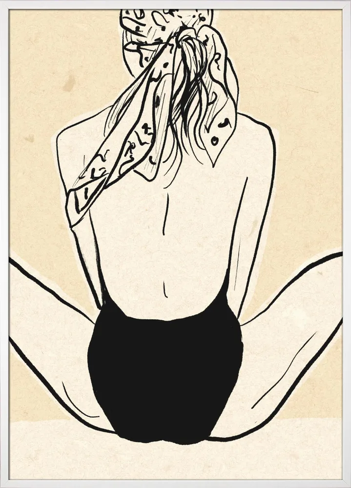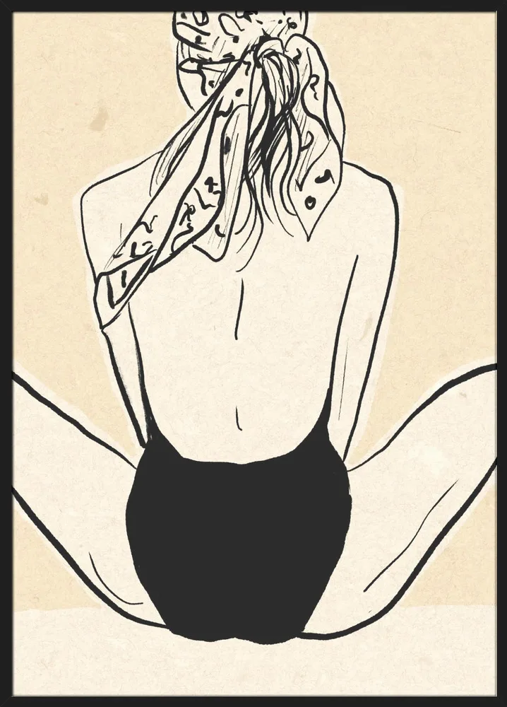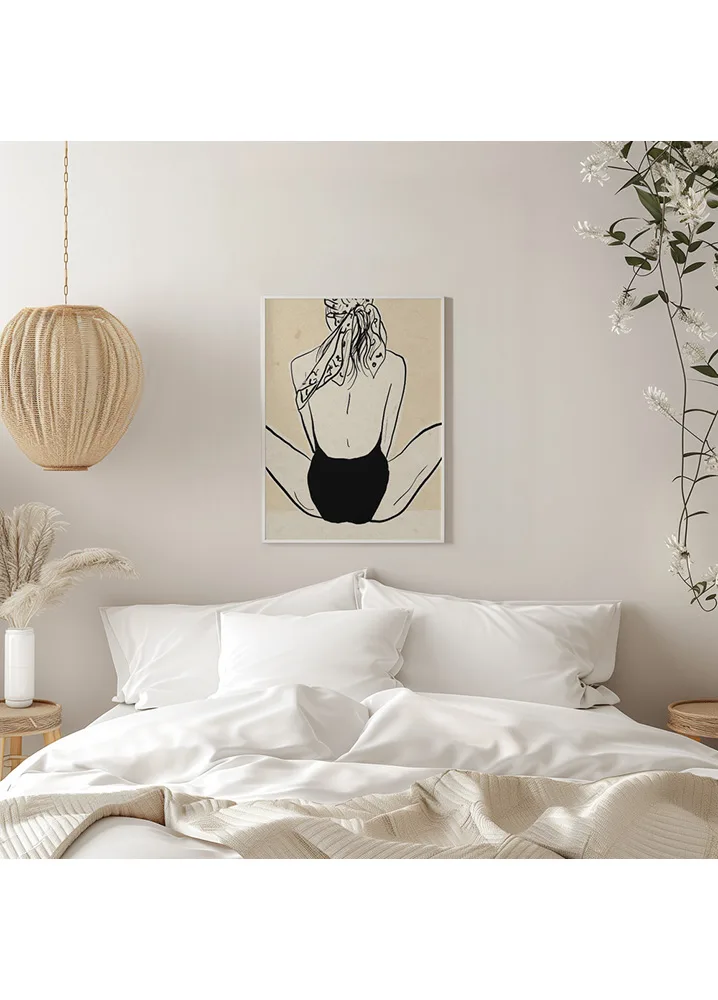 Raissa Oltmanns’ At the Beach fanger frihed og ro i et minimalistisk udtryk. Den enkle linjetegning viser en kvinde med tørklæde i håret, vendt mod havet. Kombinationen af sort streg og lys baggrund skaber en klassisk, tidløs stemning. Motivet udstråler femininitet og ro og passer perfekt i badeværelse, soveværelse eller sommerhus.