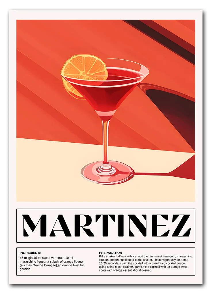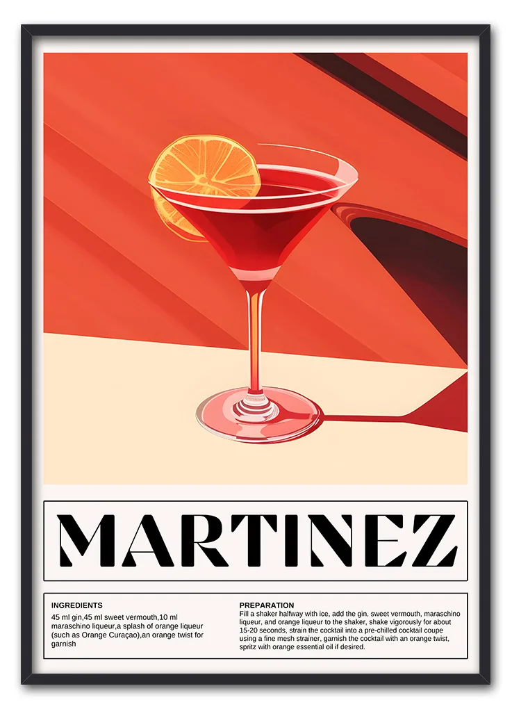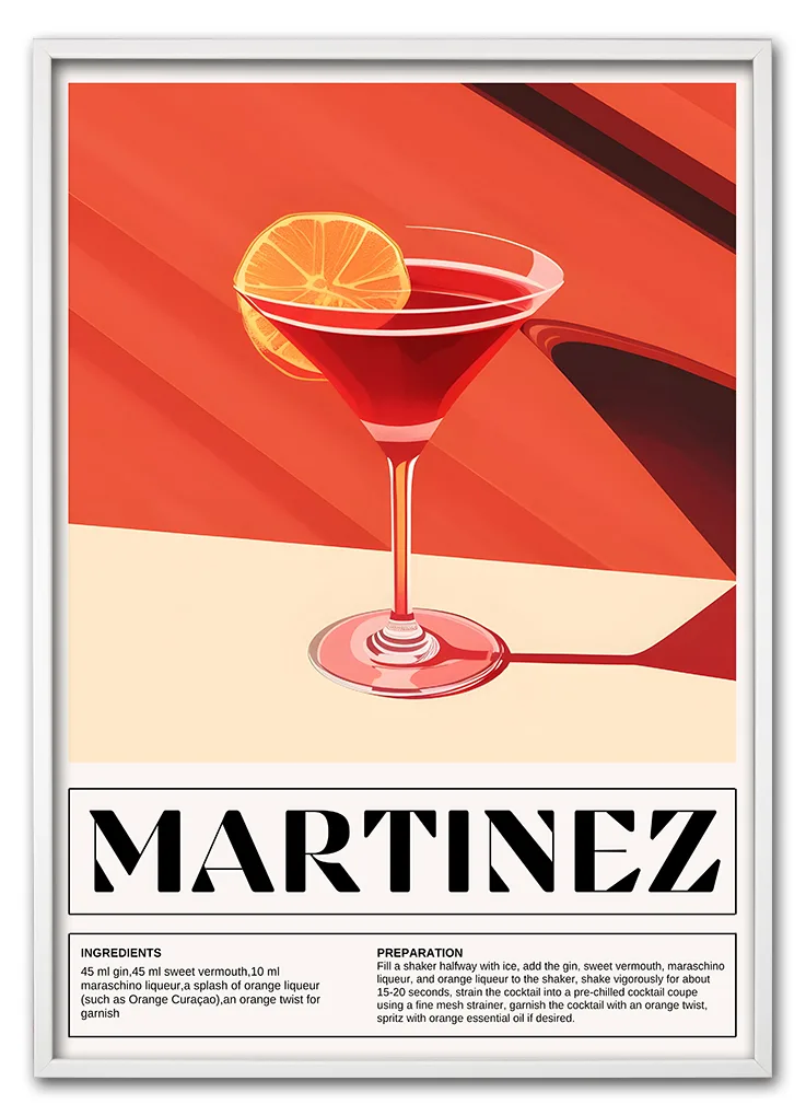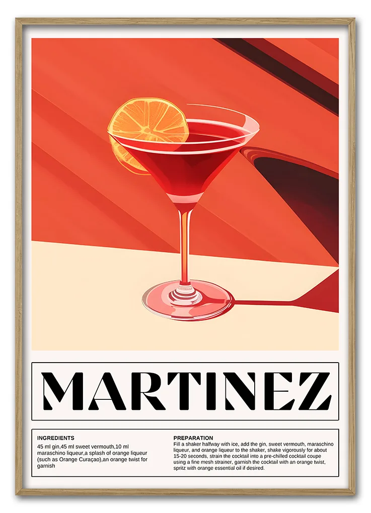 Bar Icons – Martinez er en elegant og farverig plakat med den klassiske cocktail i centrum. Farverne spænder fra rød og orange til gyldne nuancer, hvilket skaber en varm og indbydende stemning. Motivet har en retroinspireret streg og typografi, som tilfører karakter og stil. Perfekt til stuen, køkkenet eller som en del af en billedvæg med flere cocktails fra Bar Icons-serien. Martinez fungerer både alene og i selskab med drinks som Negroni, Dirty Martini eller Gin & Lemon. En ægte favorit til den designbevidste cocktailfan.