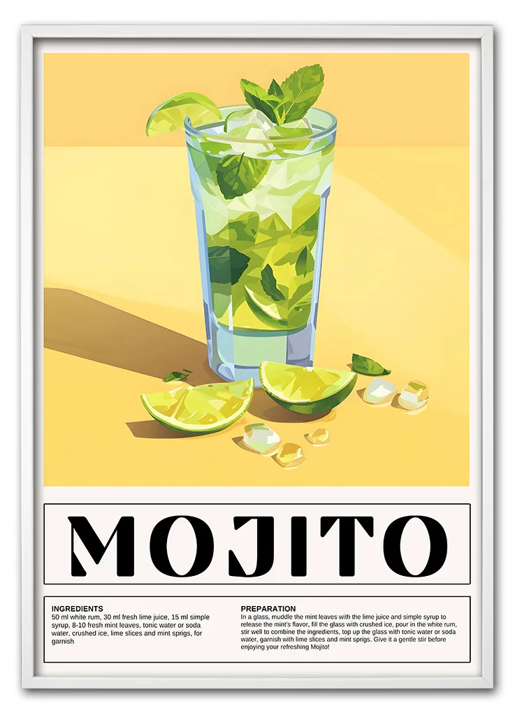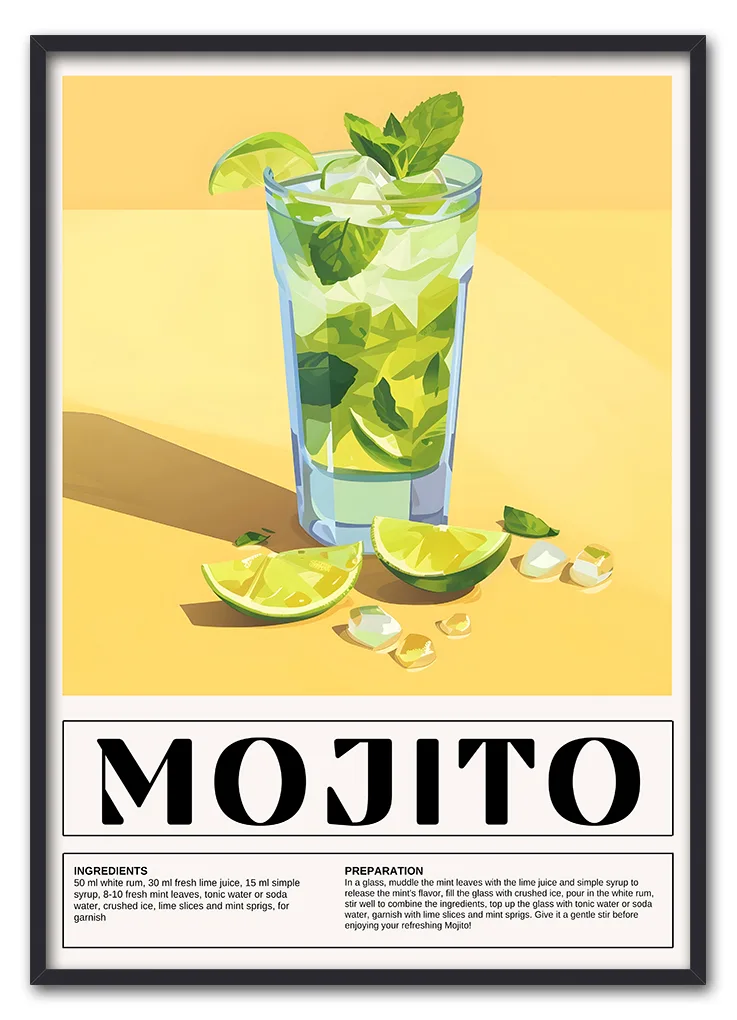 Frisk og grøn Mojito-plakat med lime og mynte. Perfekt til sommerstemning og grafisk dekoration.
