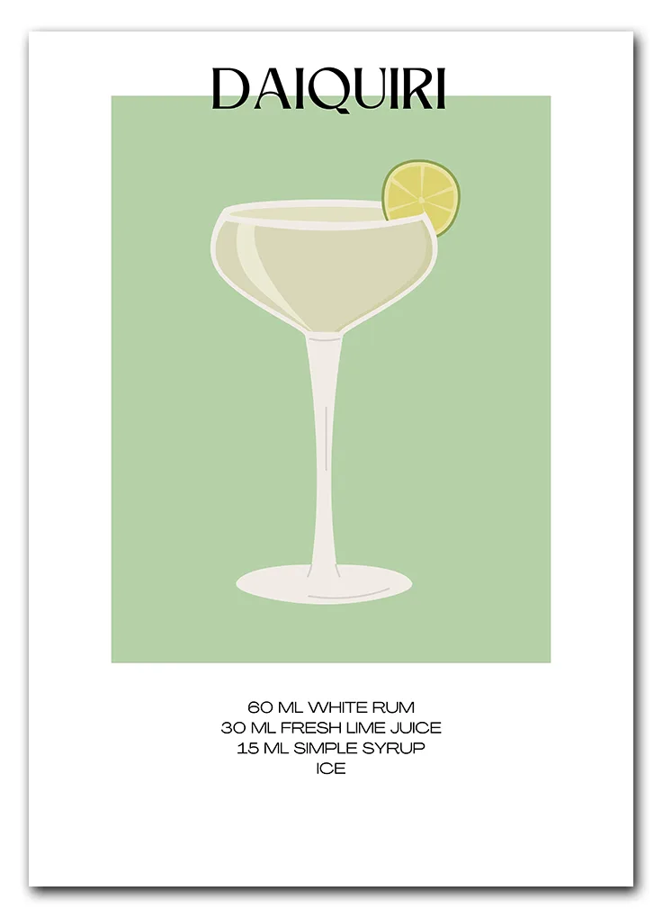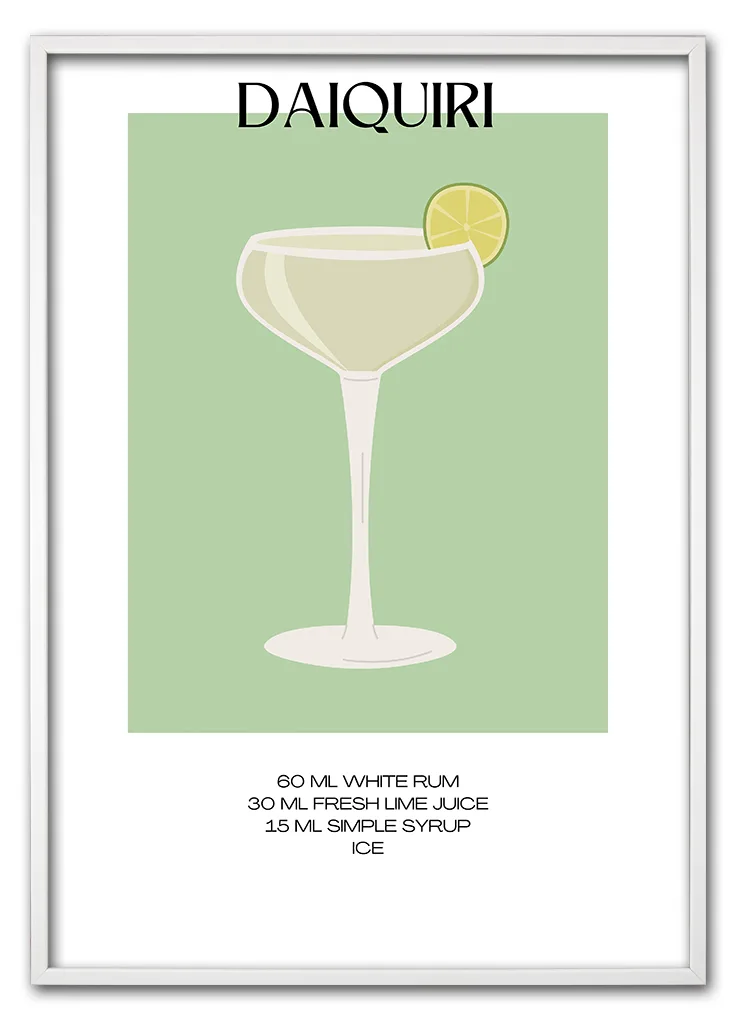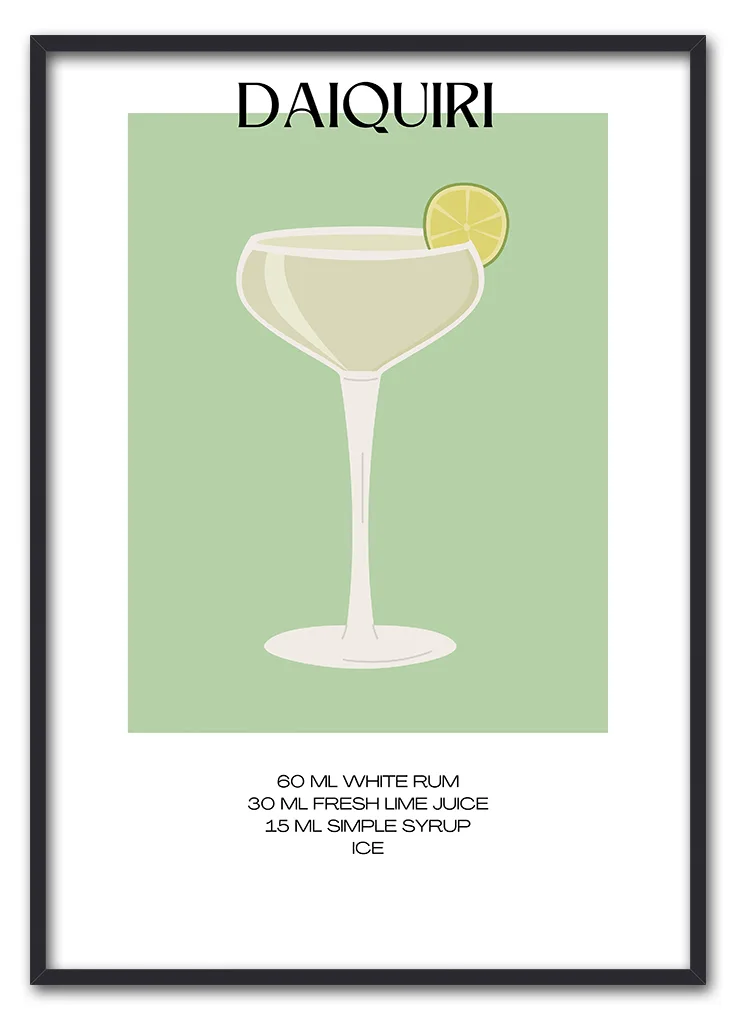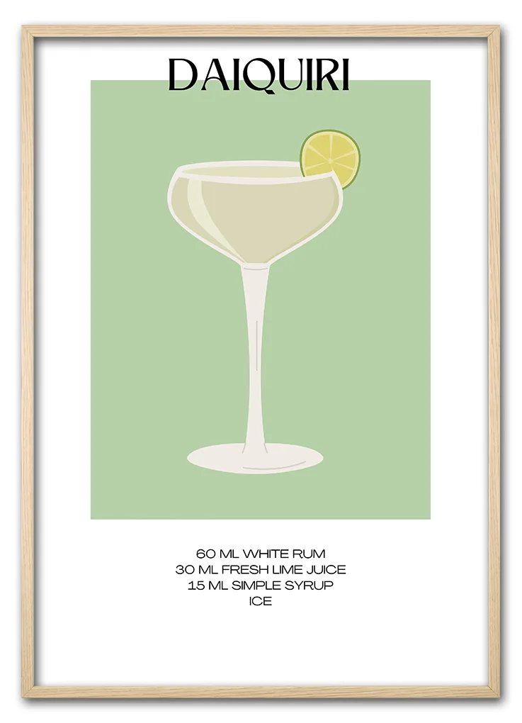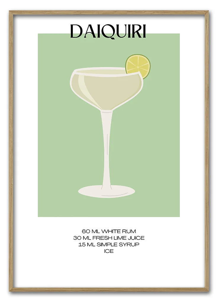 Bar Recipes – Daiquiri er en stilfuld og minimalistisk plakat med en grafisk gengivelse af den klassiske Daiquiri. Motivet viser drinken i et slankt glas på en blød grøn baggrund, og nederst finder du den præcise opskrift. Det enkle design gør plakaten nem at kombinere med andre motiver og passer perfekt ind i moderne og skandinavisk indretning. Hæng den i køkkenet, barområdet eller sommerhuset. Plakaten er en del af Bar Recipes-serien og fungerer godt sammen med fx Mojito, Margarita eller Caipirinha.