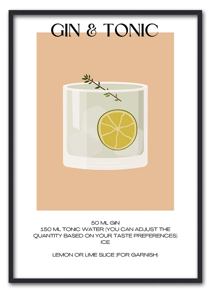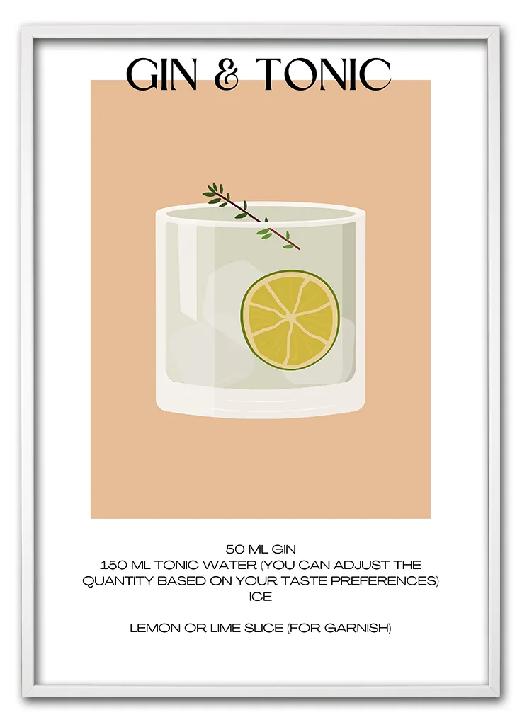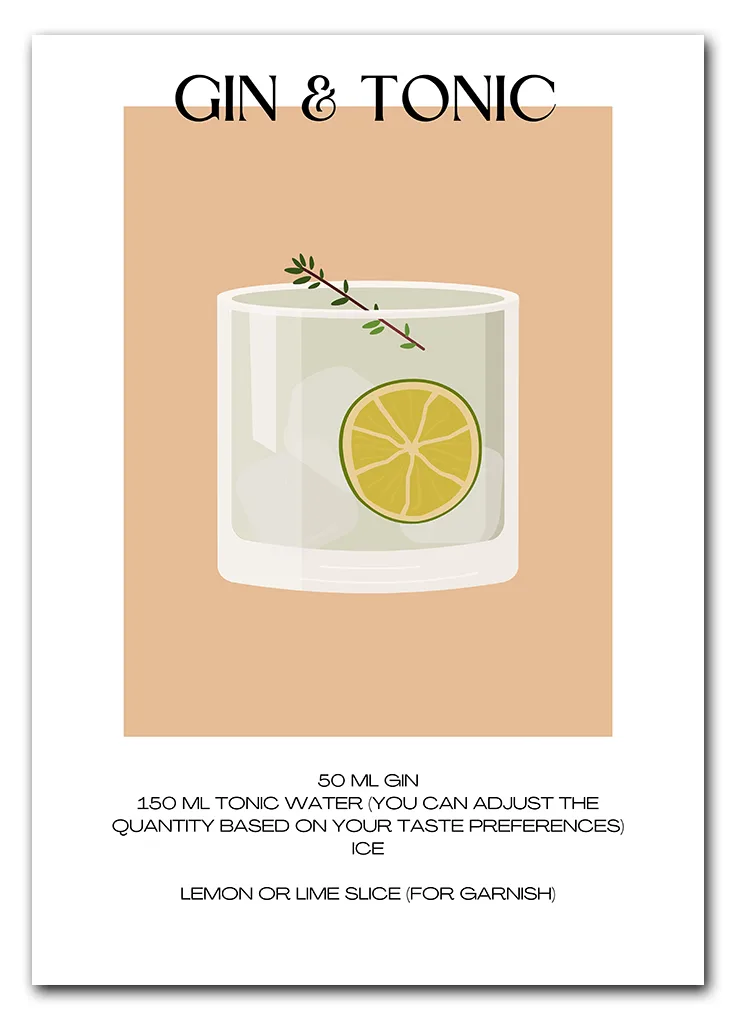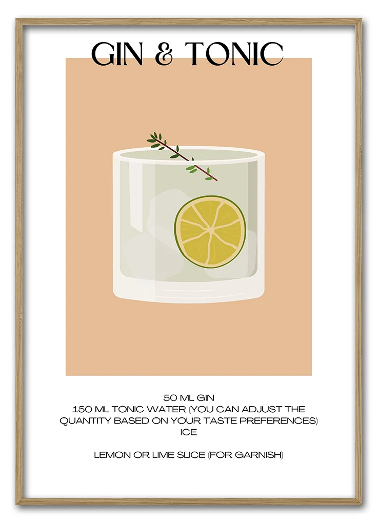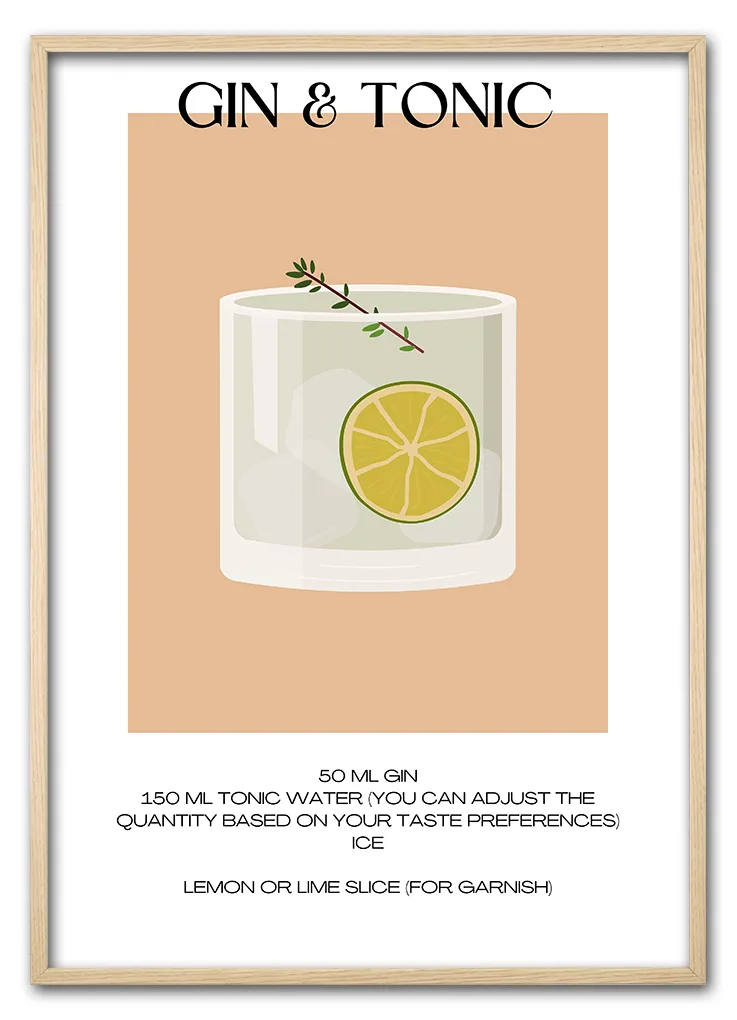 Cocktailplakat med Gin & Tonic og opskrift. Enkel og grafisk i lyse, naturlige nuancer.