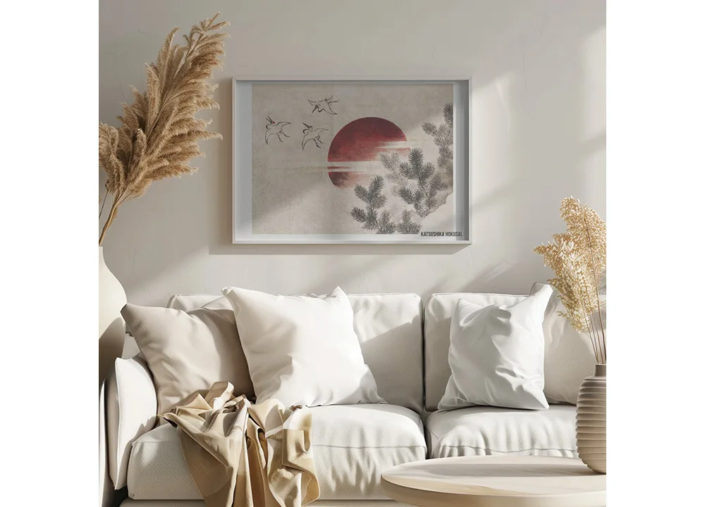 I Birds and Sunset 2 viser Katsushika Hokusai sin enestående evne til at balancere enkelhed og symbolik. Fuglene i flugt og den røde sol bag fyrretræets silhuet skaber en følelse af fred og uendelighed. De afdæmpede jordfarver gør motivet alsidigt og let at integrere i skandinavisk indretning. Hæng det i stuen eller soveværelset for et roligt, naturligt udtryk med historisk dybde.