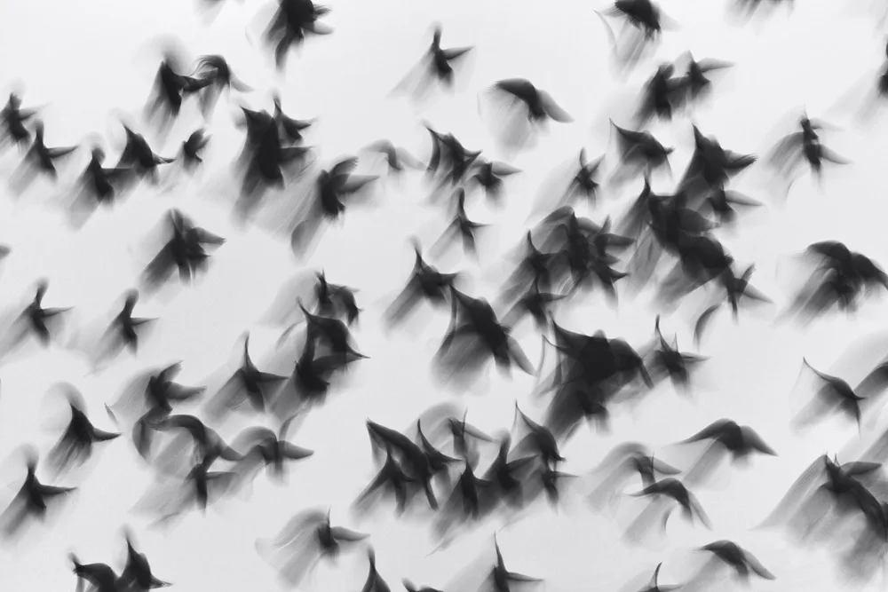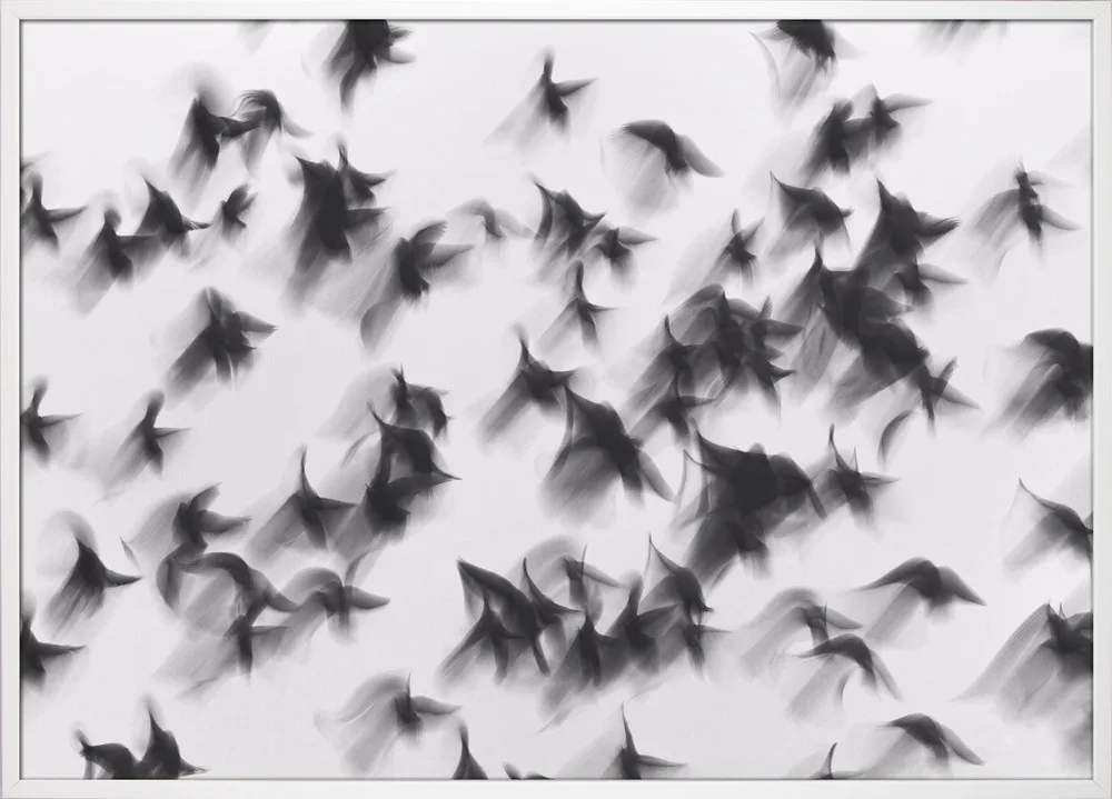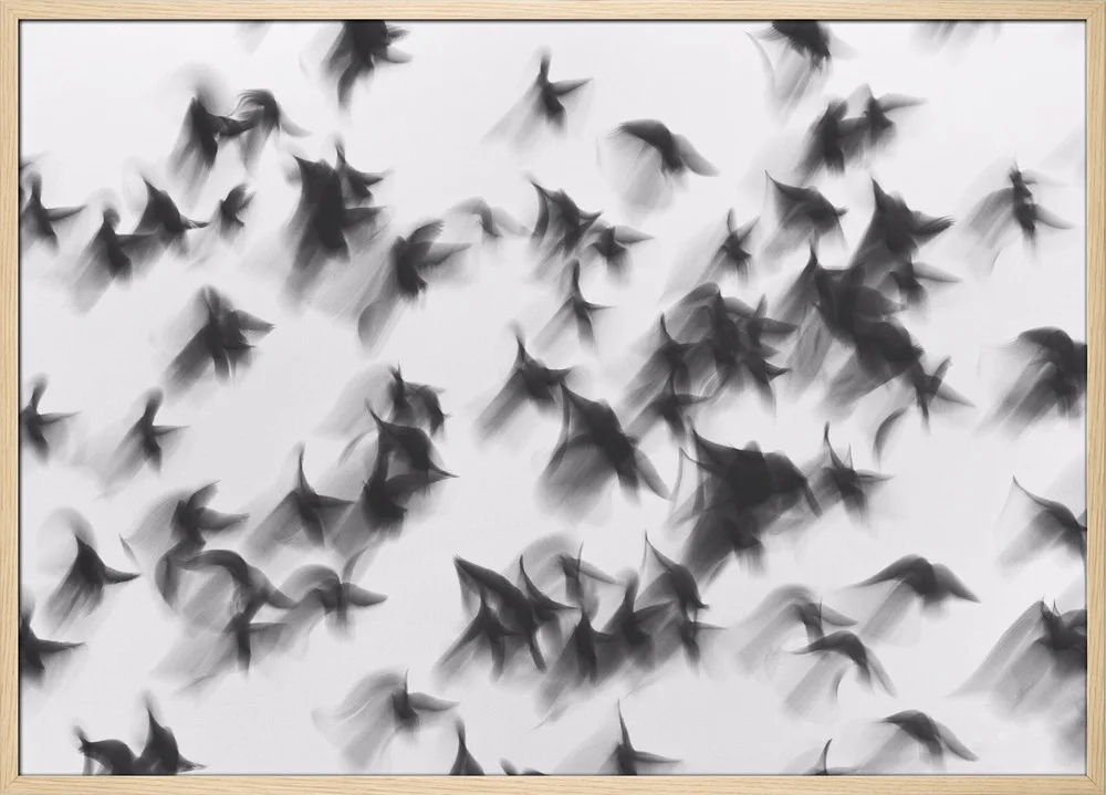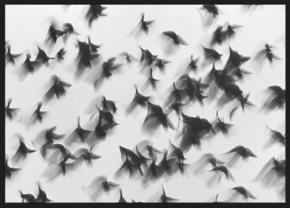 Kunstnerisk foto af en flok fugle i flugt – let, flydende og drømmende.
