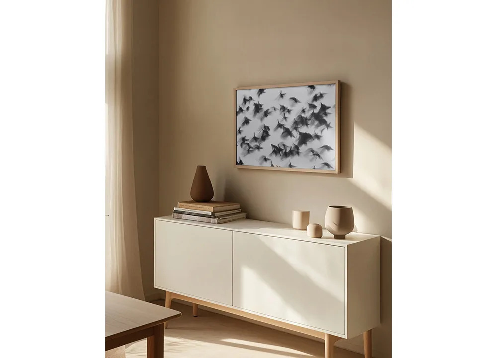 Birds af Marina Yushina er et poetisk fotografi i sort/hvid, der fanger bevægelsen af fugle i luften. De slørede former giver billedet en abstrakt og drømmende karakter, hvor lys og skygge flyder sammen. Et motiv, der bringer lethed og luft ind i rummet – perfekt til stuer, soveværelser eller arbejdsrum med nordisk, minimalistisk stil.