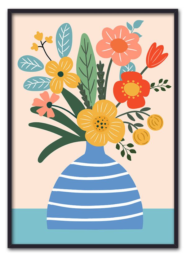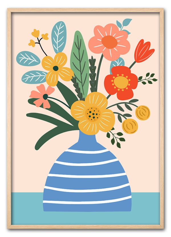 Blooms in Blue No. 02 er en dekorativ plakat med en stribet blå vase fyldt med en frodig buket af blomster i gule, røde og grønne nuancer. Baggrunden i lys fersken skaber varme og gør motivet let at integrere i lyse eller farverige hjem. Stilen er enkel, men grafisk med tydelige former og stor farveglæde. Motivet passer smukt i stuen, entréen eller som en farverig detalje i køkkenet. Plakaten er en del af serien Blooms in Blue, som også tæller No. 01 og No. 03 – en oplagt trio til en billedvæg med blomstrende stemning.