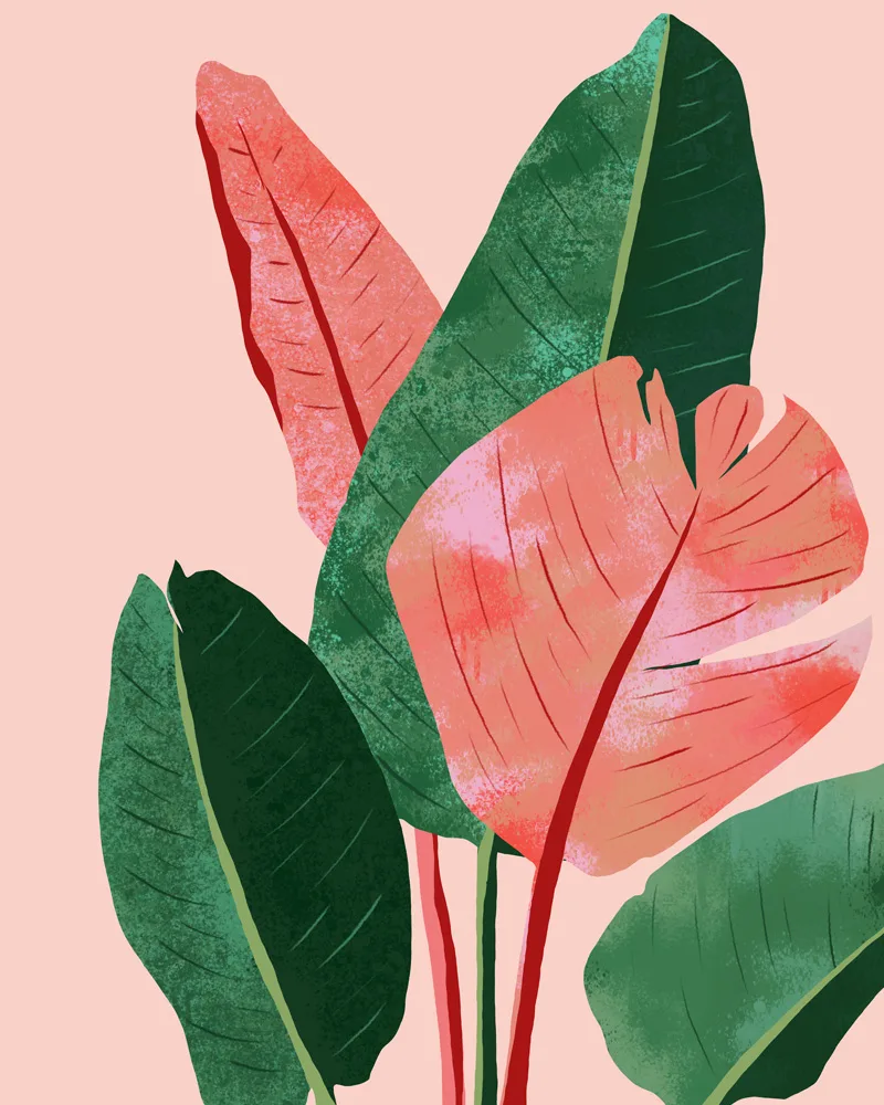 Tropisk planteillustration af Uma Gokhale i lyserøde og grønne toner. Et elegant motiv med moderne varme.