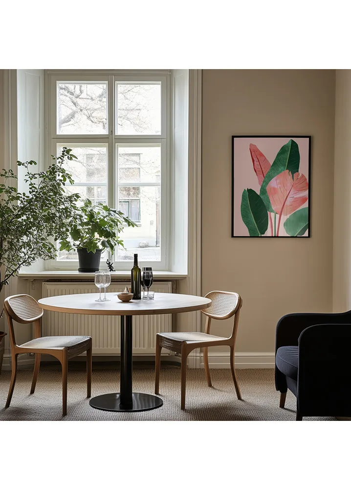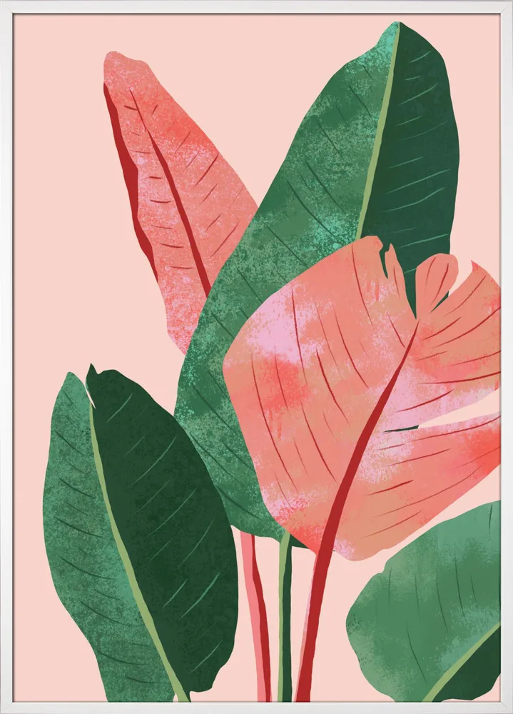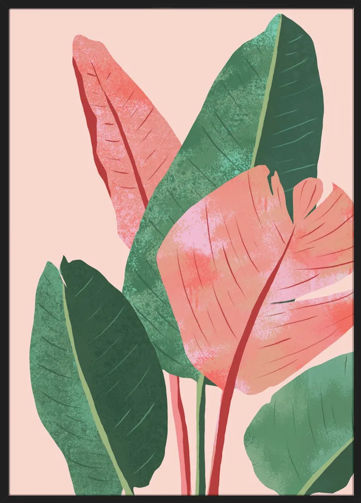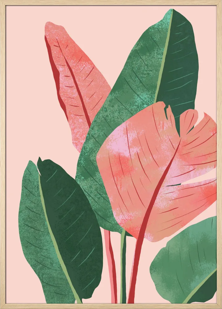Blush Tropical af Uma Gokhale bringer tropisk friskhed ind i hjemmet. Store grønne blade med rosa nuancer står i flot kontrast til den lyse baggrund, og motivet emmer af sol og ro. Stilen er enkel og stilren med fokus på form og farvespil, hvilket gør plakaten ideel til alt fra stuen til kontoret. De varme pink og grønne toner tilføjer liv uden at virke dominerende og passer perfekt til en moderne, boho-inspireret indretning.