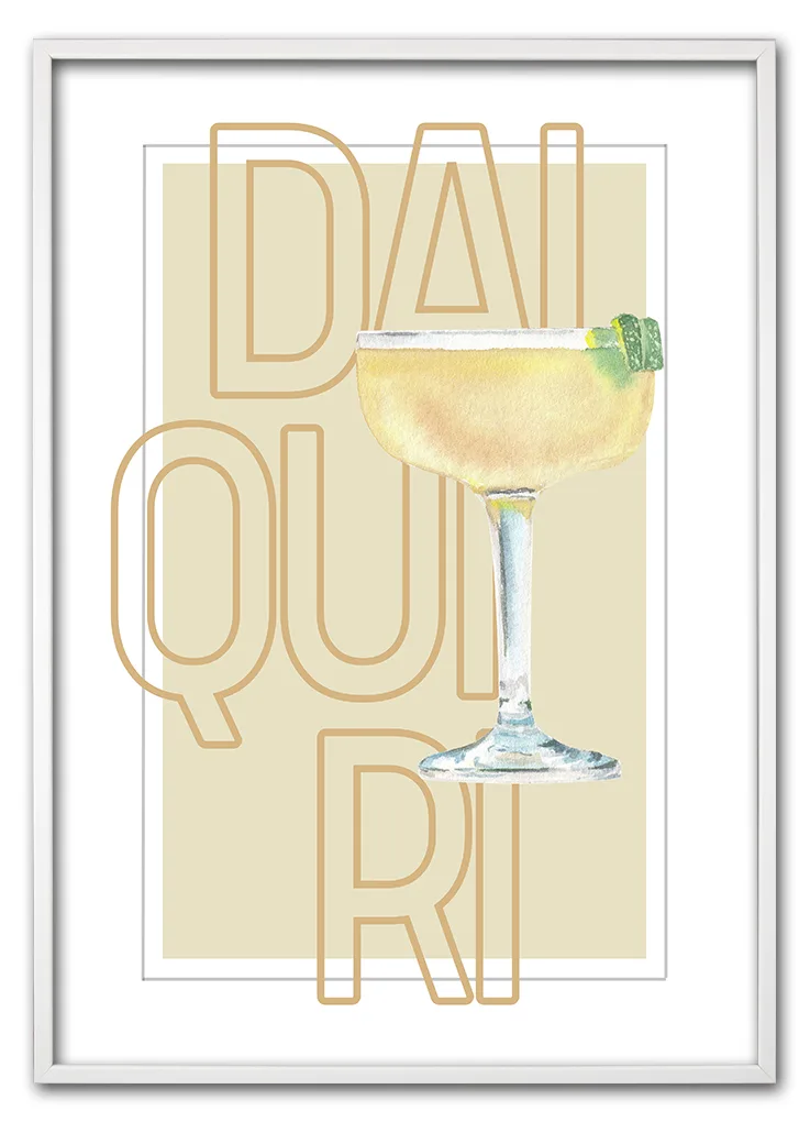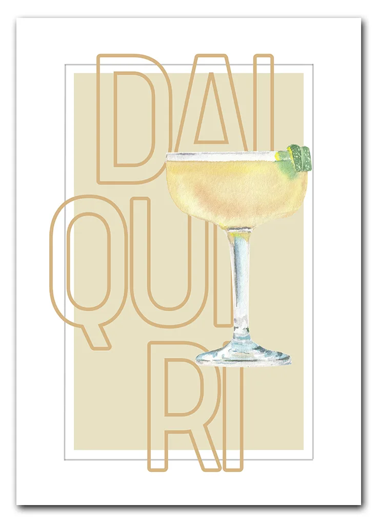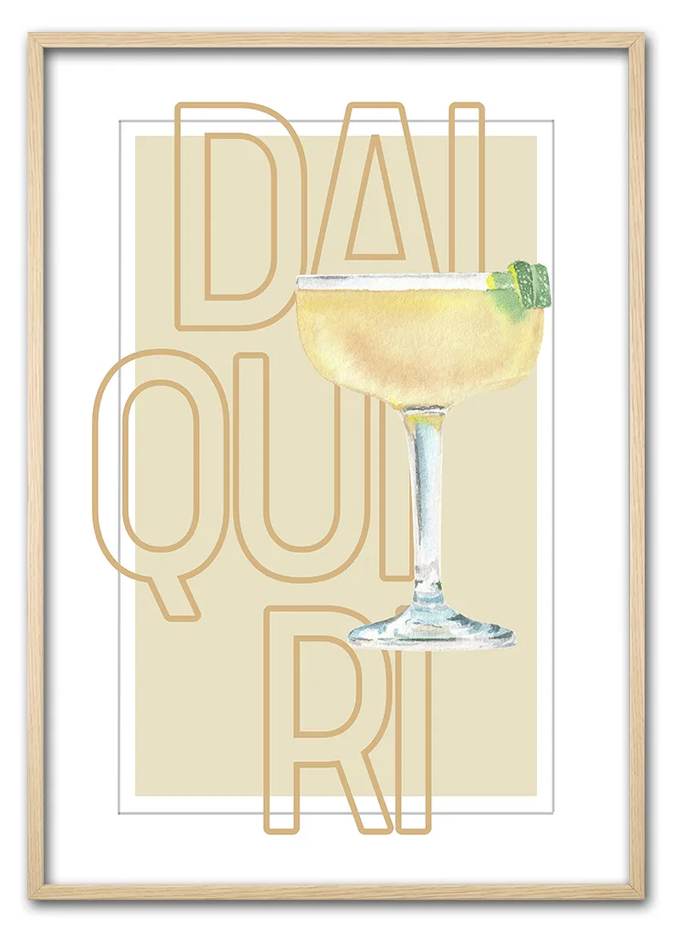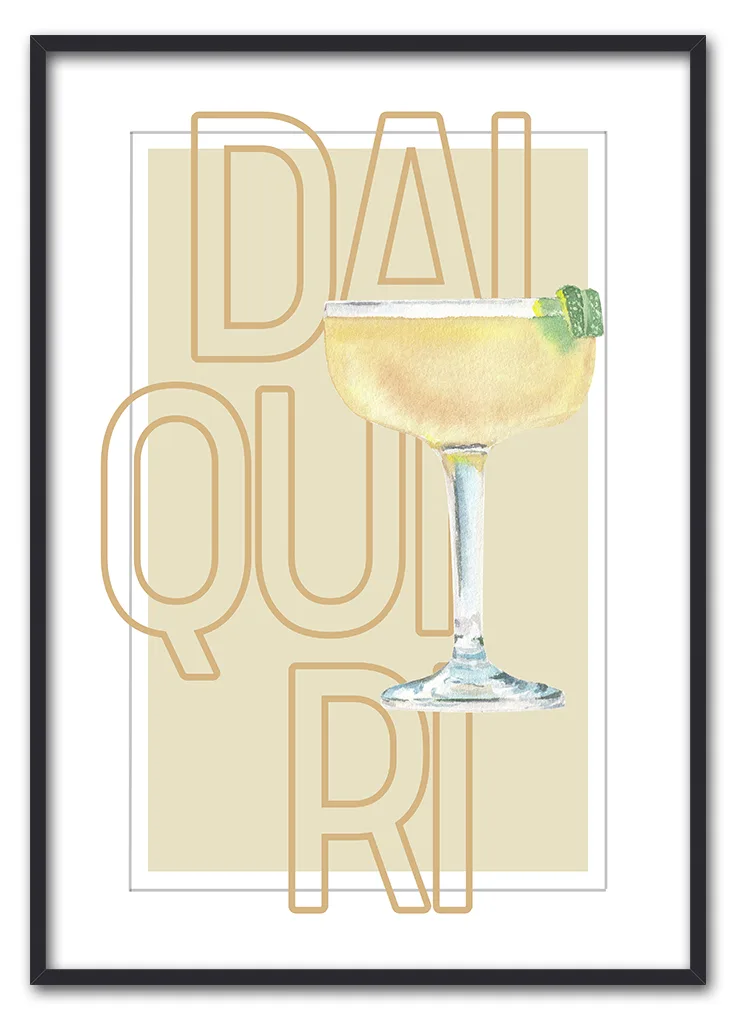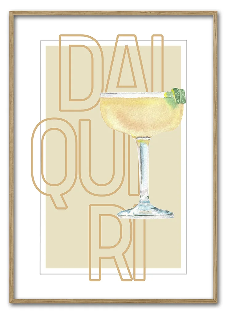Bold Spirits – Daiquiri præsenterer den klassiske cocktail med finesse og varme farver. Baggrunden er dæmpet beige, mens glasset med den gyldne drink står tydeligt frem. De store bogstaver i baggrunden staver ‘Daiquiri’ på kryds og tværs, hvilket giver et moderne og dynamisk udtryk. Limegarnish og skygger tilføjer liv og dimension. Motivet passer perfekt til køkken, barområde eller sommerhus og er en del af Bold Spirits-serien. Sæt den sammen med Margarita eller Mojito for en tropisk og stilfuld cocktailvæg.