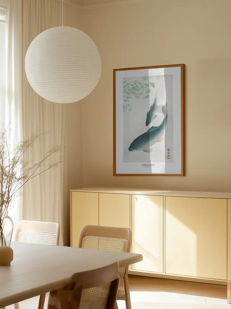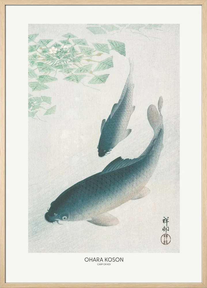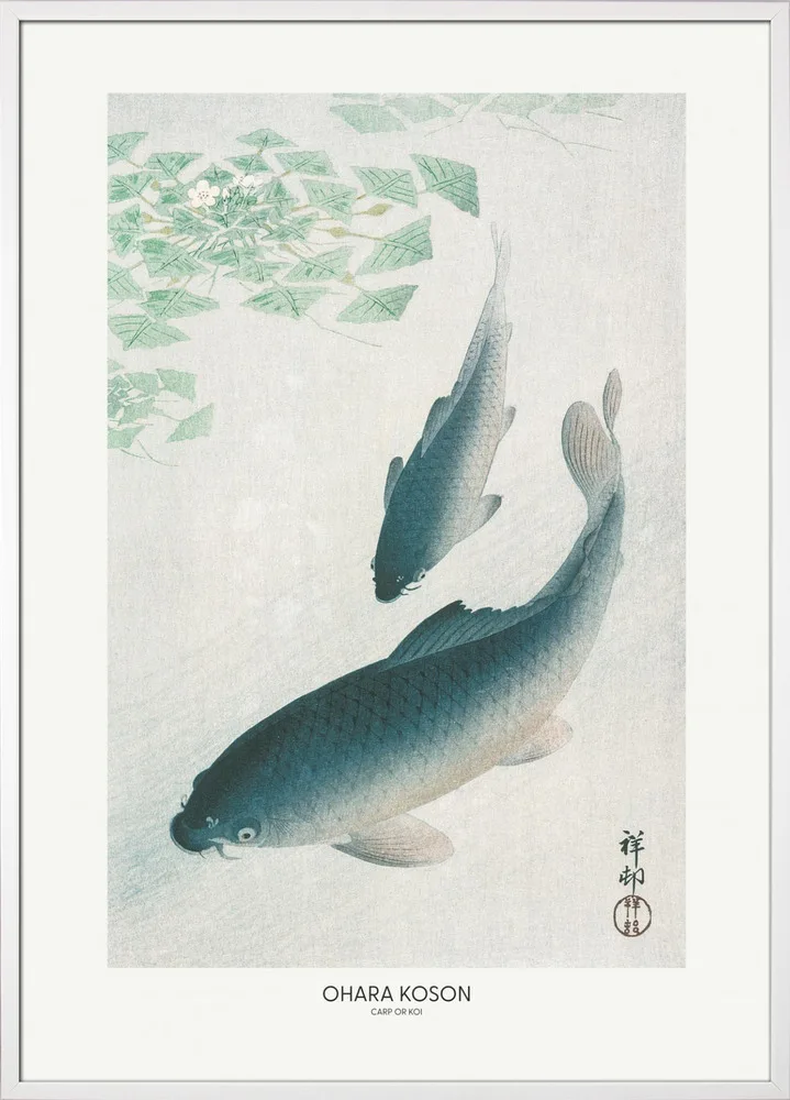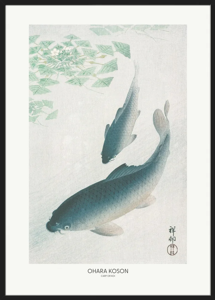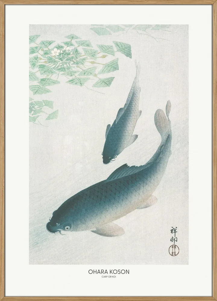Carp or Koi af Ohara Koson er et ikonisk værk fra den japanske naturkunst. De to karper bevæger sig harmonisk gennem det lysegrønne vand, gengivet med bløde nuancer og fine detaljer i skællene. Motivet symboliserer styrke og udholdenhed – værdier, der går igen i japansk kultur. Den rolige farvepalet med blå, grønne og hvide toner gør plakaten velegnet til stuer, kontorer eller soveværelser, hvor man ønsker et naturligt og afbalanceret udtryk.