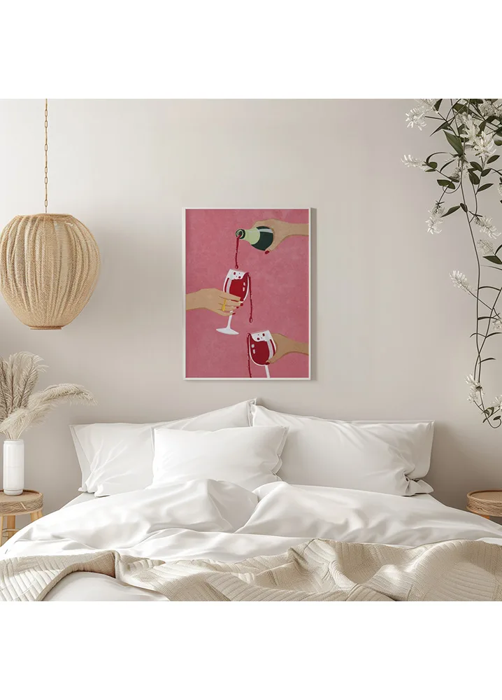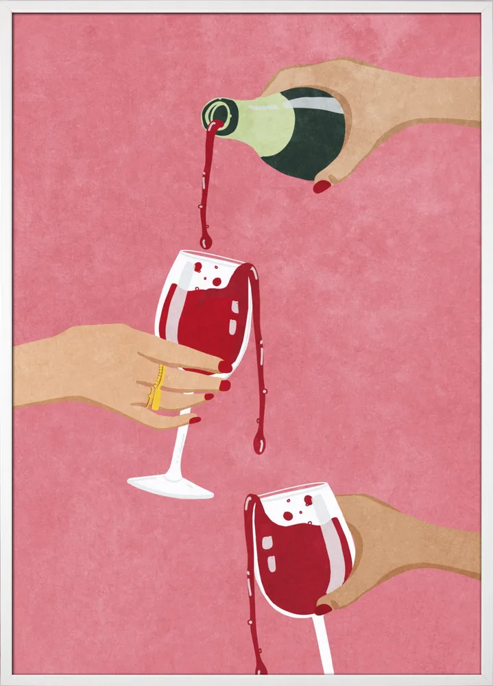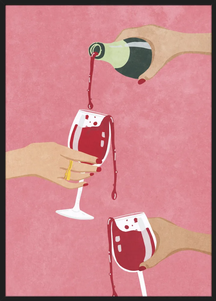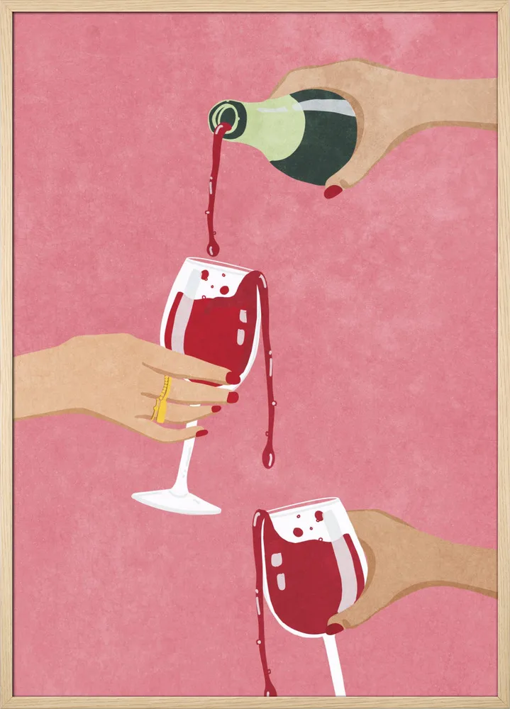 Raissa Oltmanns’ Cheers to my Girl Gang hylder fællesskab og venindeskab. Med et stænk af humor og glamour viser motivet hænder, der hælder vin i glas mod en rosa baggrund. Farvespillet mellem rød, pink og grøn skaber en energisk stemning, perfekt til køkken, stue eller som gaveidé. En plakat der spreder god stemning og smil.