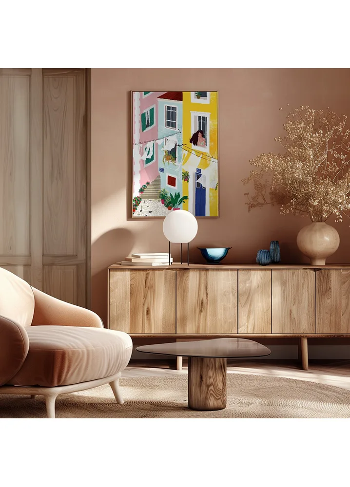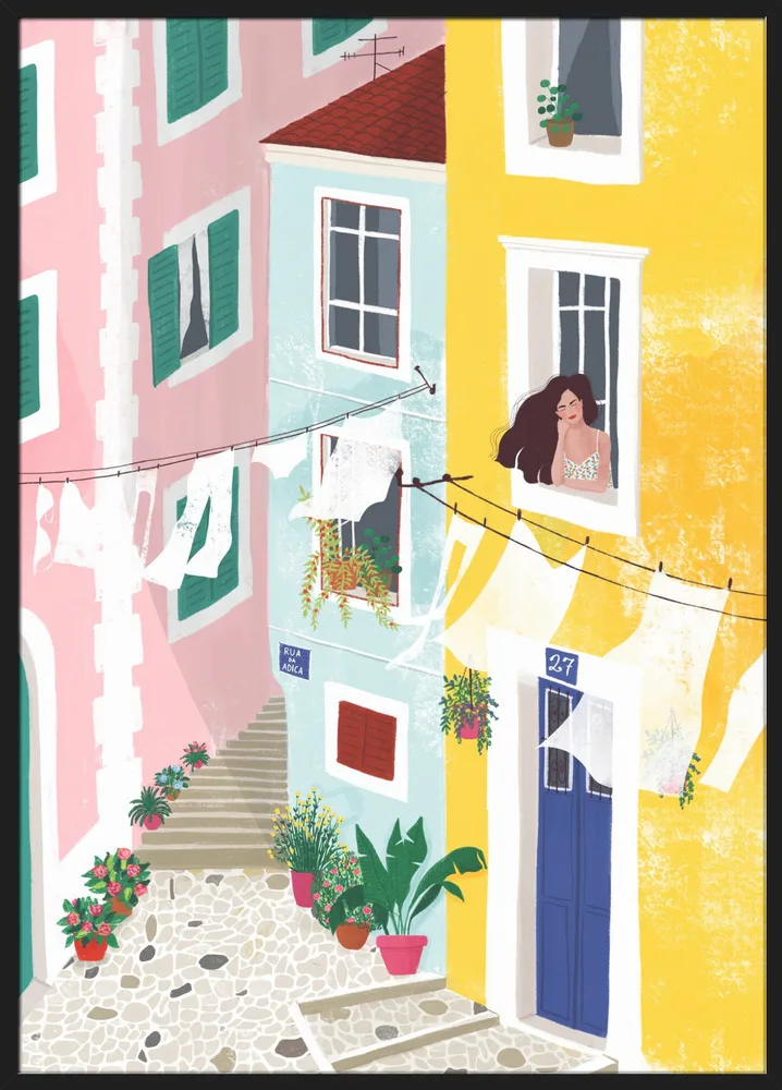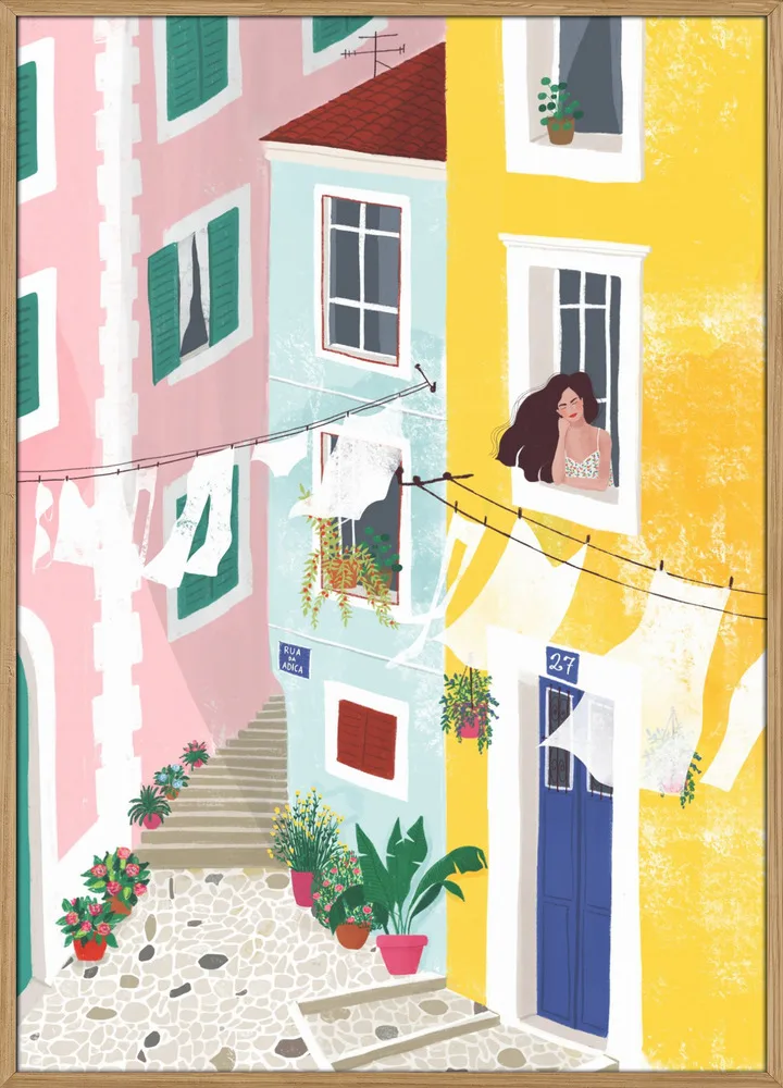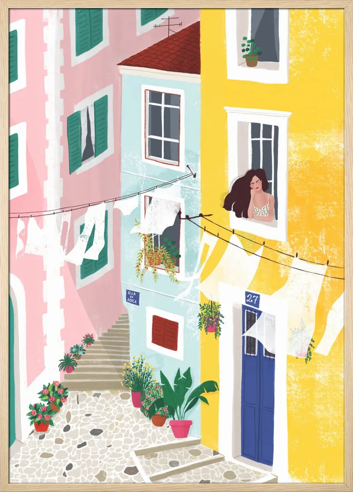 Charmerende illustration af Maja Tomljanovic med kvinde i farverigt gårdmiljø. Et livligt og sydlandsk motiv.