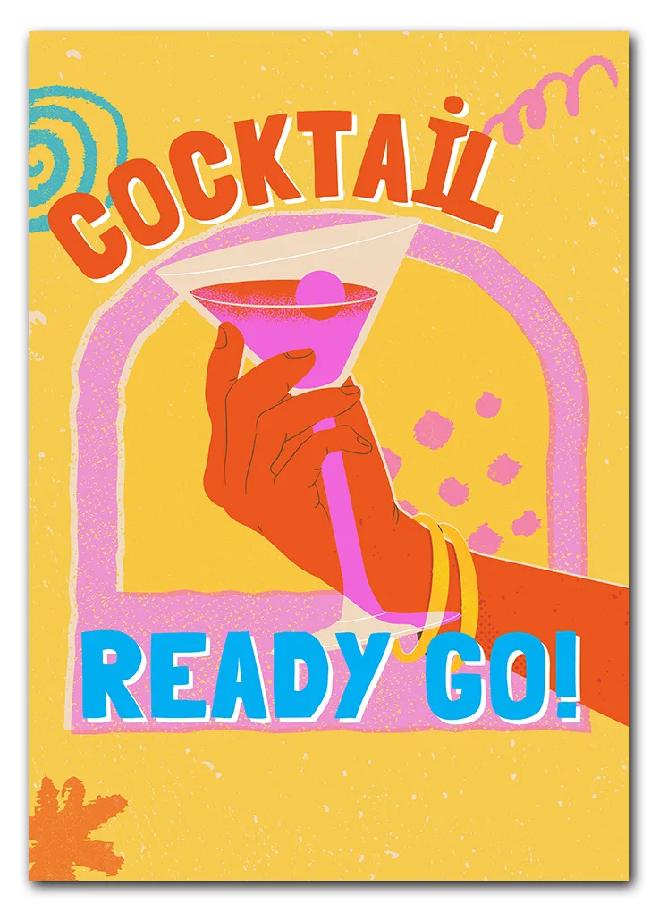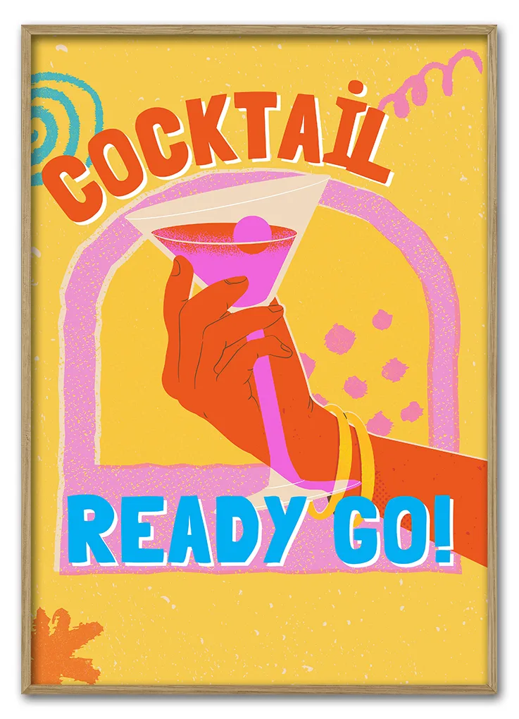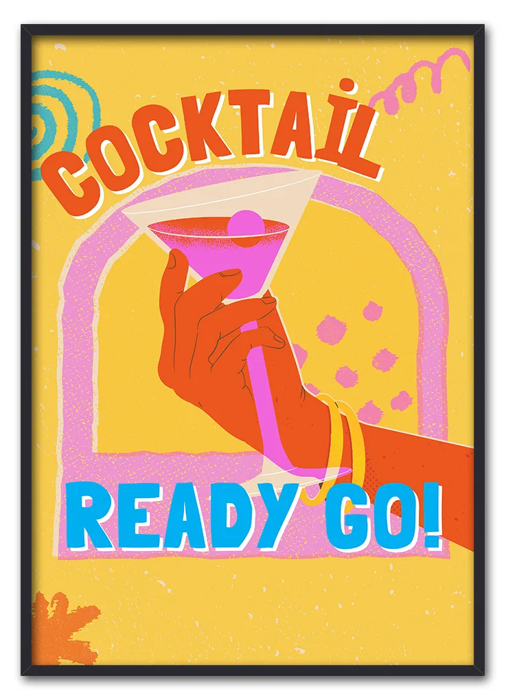 Farverig pop art-plakat med cocktail og teksten READY GO. En energisk plakat med retrostil og power.