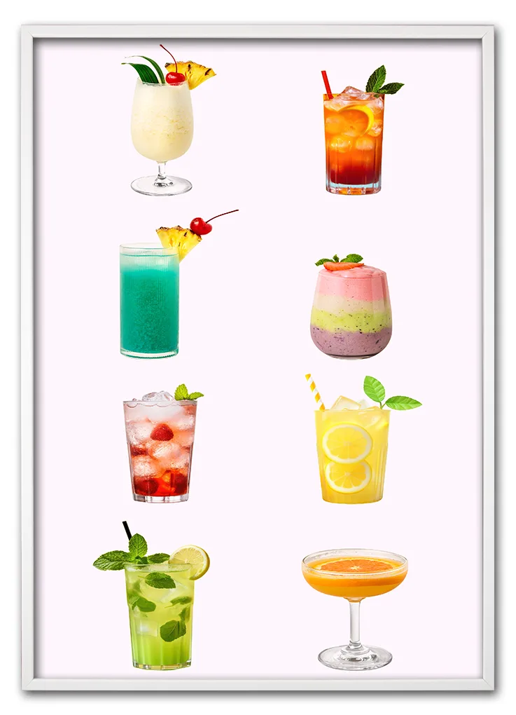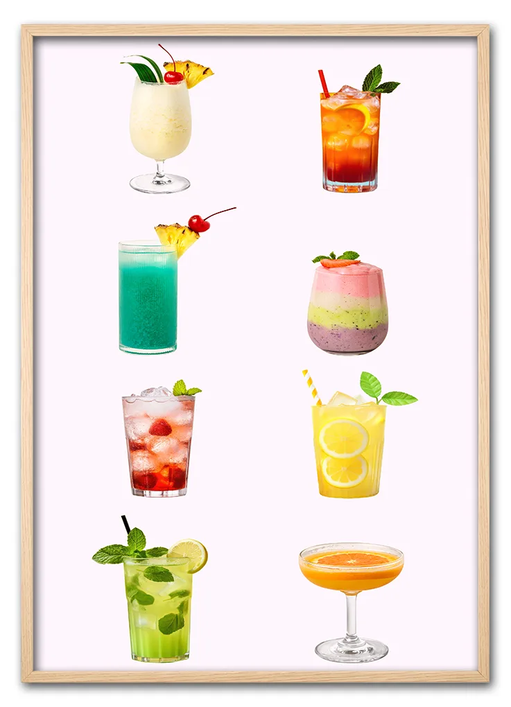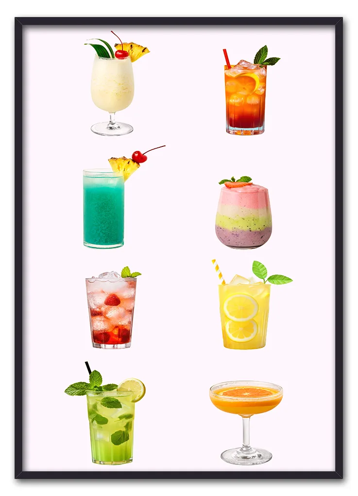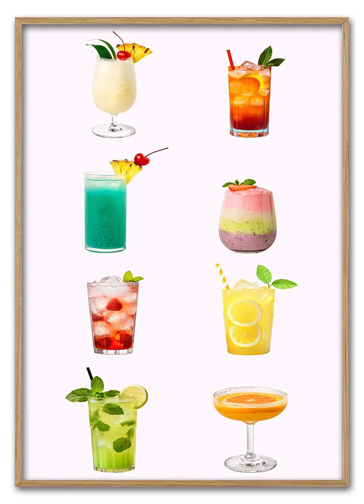 Ni forskellige cocktails i farverige illustrationer. En dekorativ og inspirerende drinksplakat.