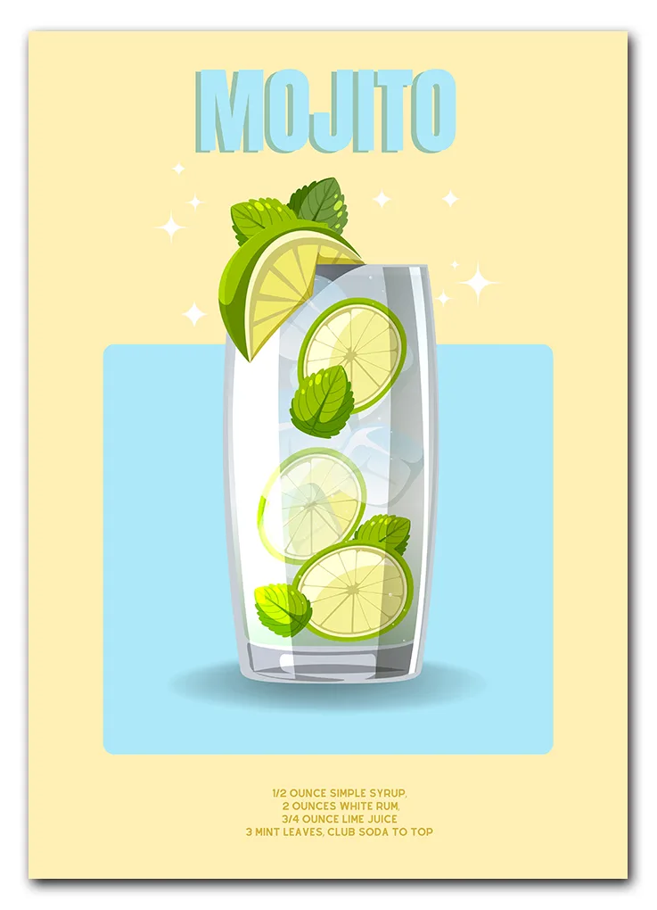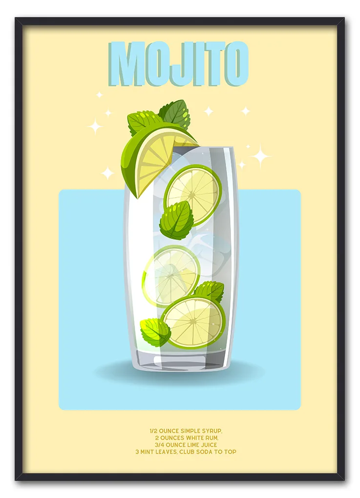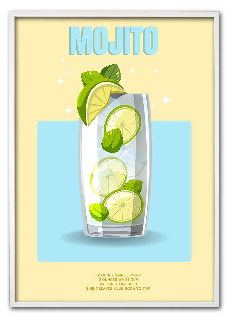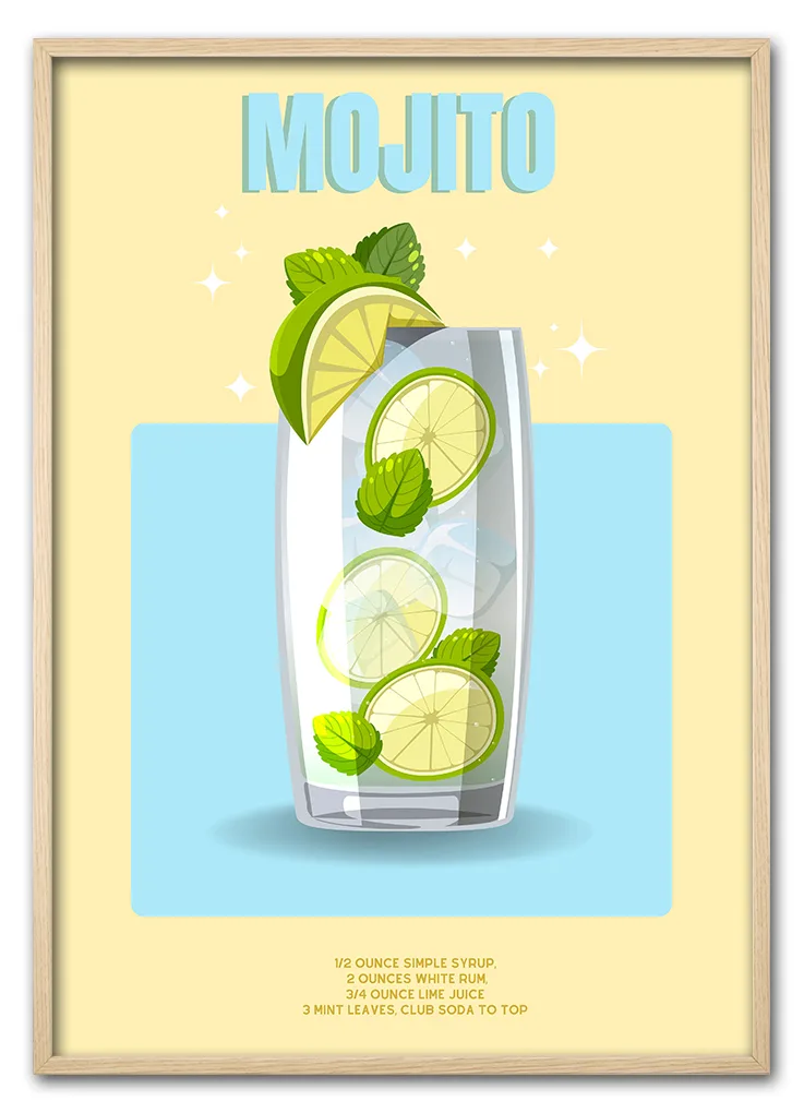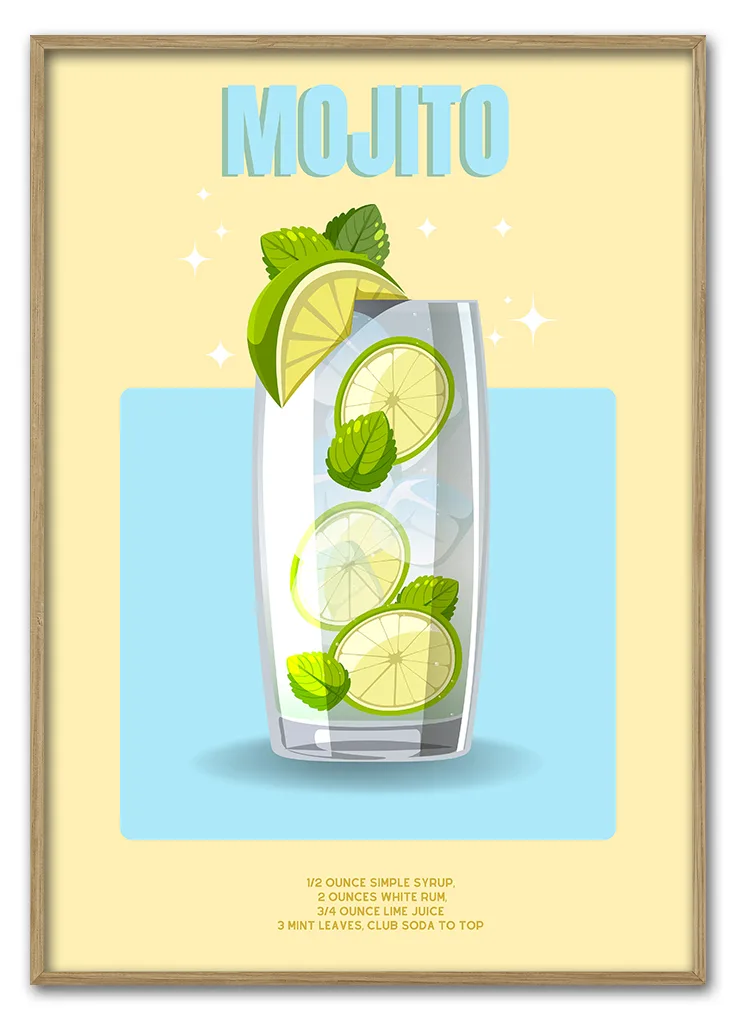 Pastelfarvet plakat med Mojito og tekst. Frisk og enkel i stil og udtryk.