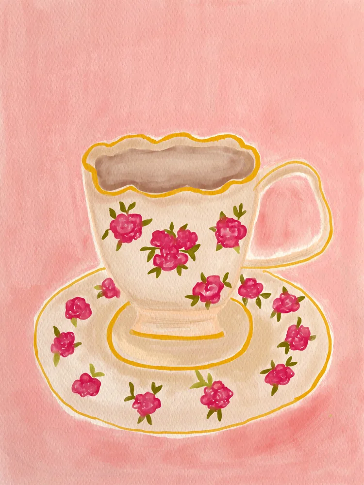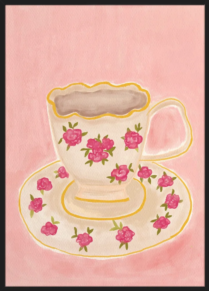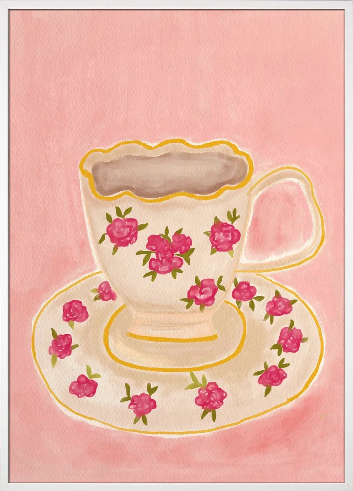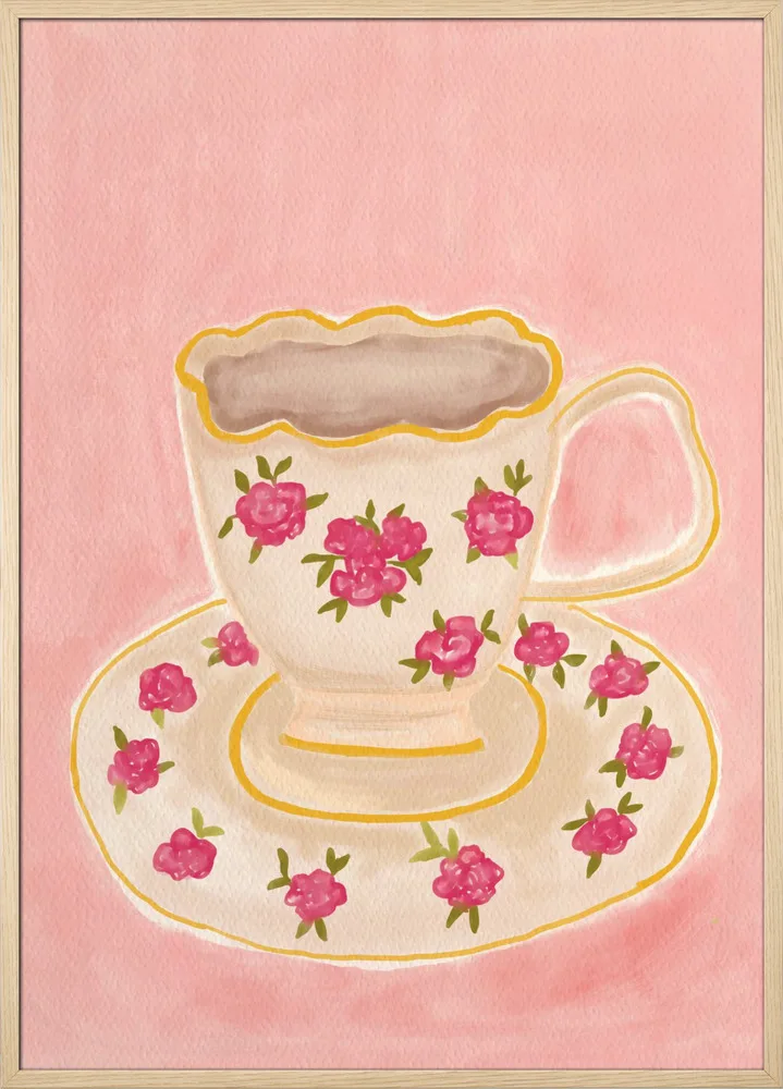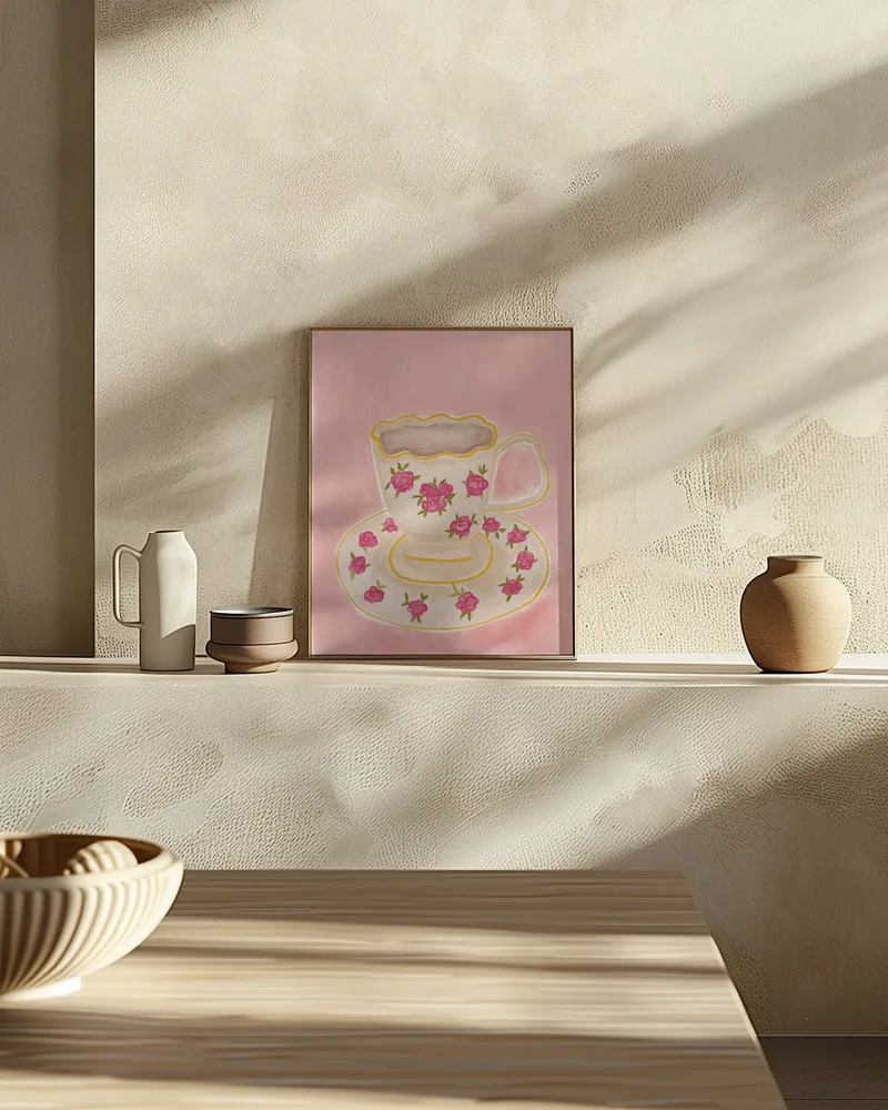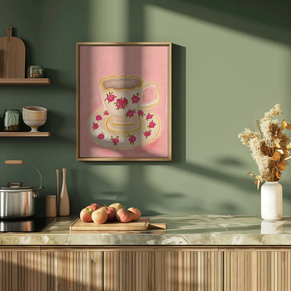 Et elegant motiv med en kop hvid te i blide toner. Skaber ro og harmoni i køkkenet eller læsehjørnet.
