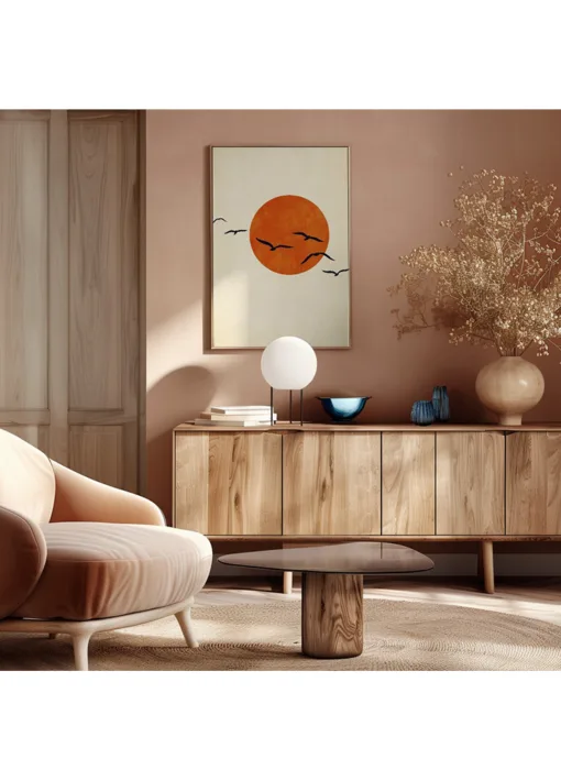 Dancing With the Sun af Kubistika forener enkelhed og poesi i et stilrent naturmotiv. Den store brændte orange sol står smukt imod den lyse beige baggrund, mens fuglene i sort skaber bevægelse og lethed. Den rene komposition gør værket tidløst og let at integrere i enhver indretning. Velegnet til stue, entré, soveværelse eller rum med naturmaterialer. Et motiv, der skaber ro og varme med få elementer.