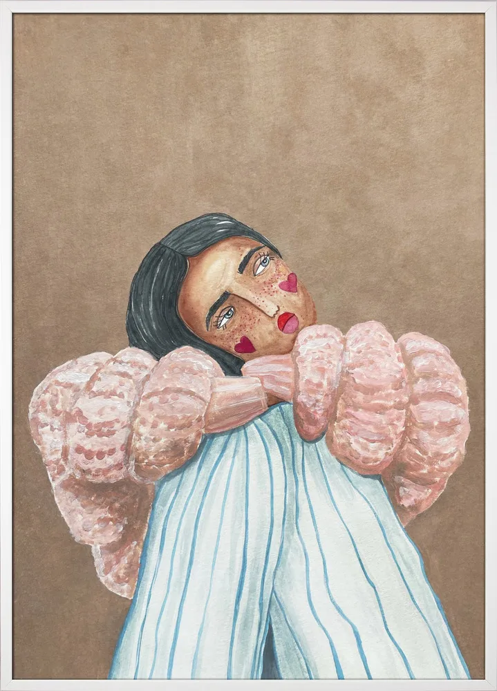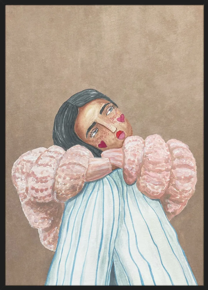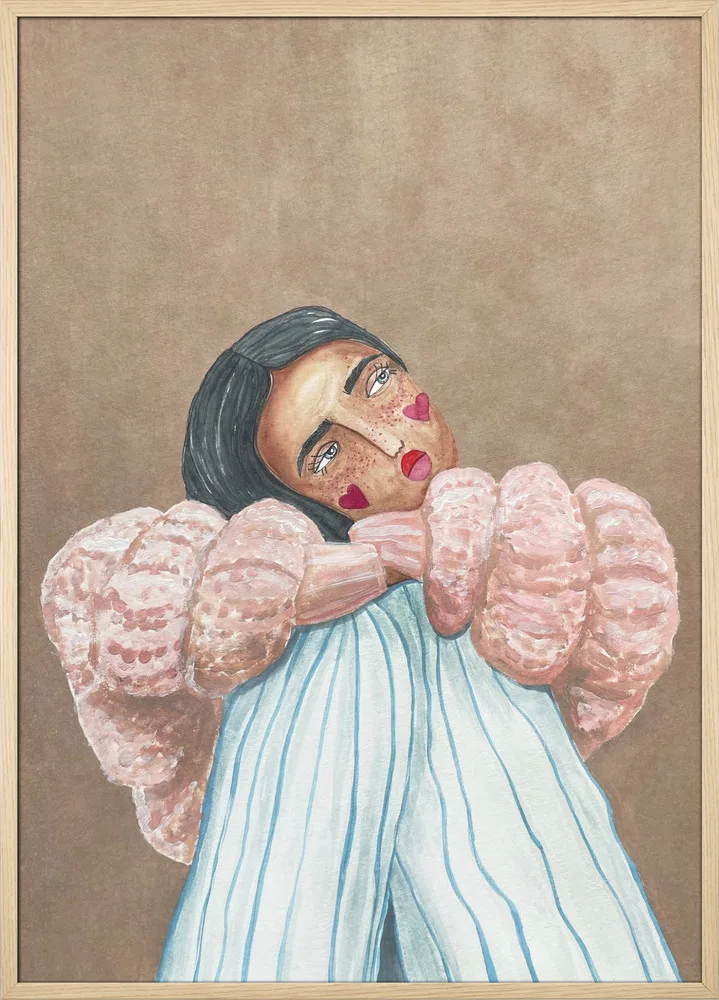 Dreaming Girl af Raissa Oltmanns skildrer en kvinde i pastelfarvede klæder, fanget i et øjeblik af eftertænksomhed. De rolige toner af beige, rosa og blå giver motivet en varm og drømmende stemning. Oltmanns’ sans for tekstur og udtryk gør plakaten ideel til soveværelse, kontor eller kreative rum, hvor den tilføjer ro og personlighed.