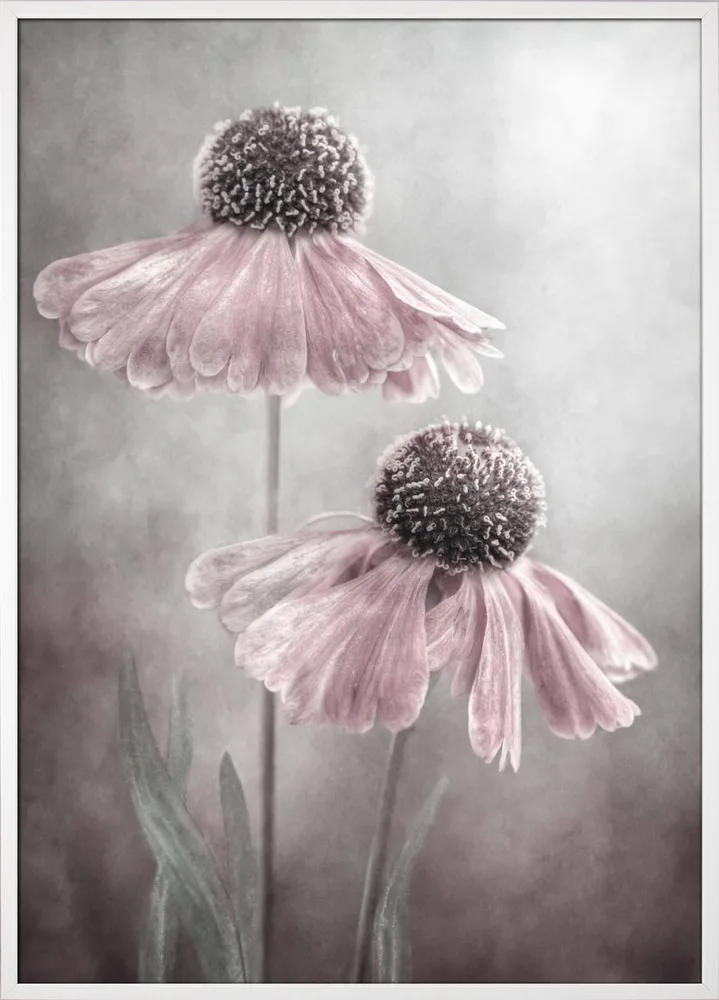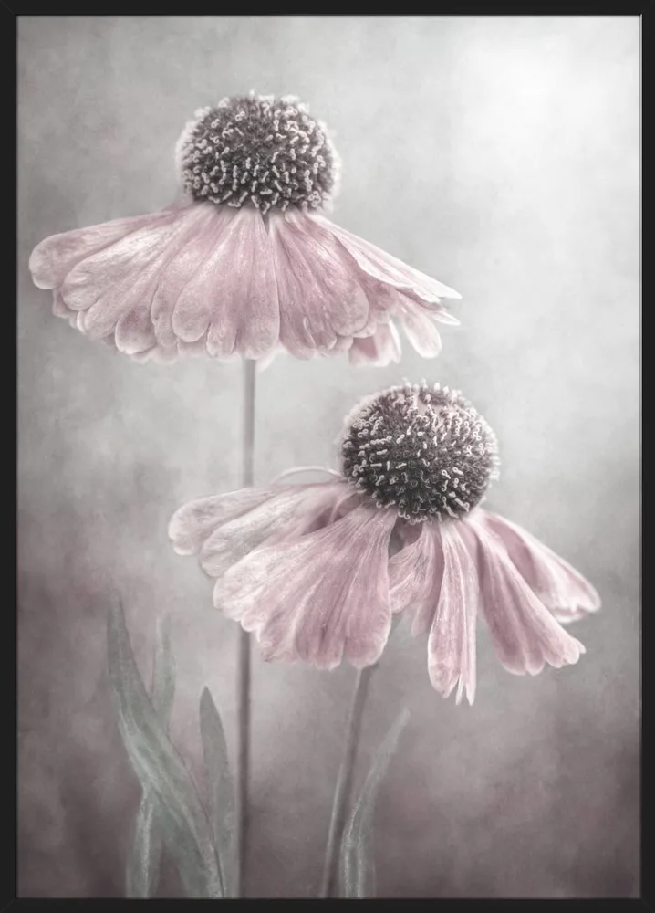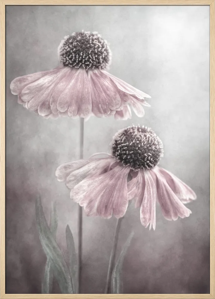 Duet af Mandy Disher er et roligt og poetisk blomsterportræt, hvor to stående blomster deler billedet som en harmonisk samtale. Mandy Disher er kendt for sin evne til at skabe stemningsfulde, drømmende og følelsesladede blomstermotiver, og Duet er et stærkt eksempel på denne stil. De støvede rosa og grå farver giver plakaten et blødt og afbalanceret udtryk, mens den diffuse baggrund skaber dybde og ro.