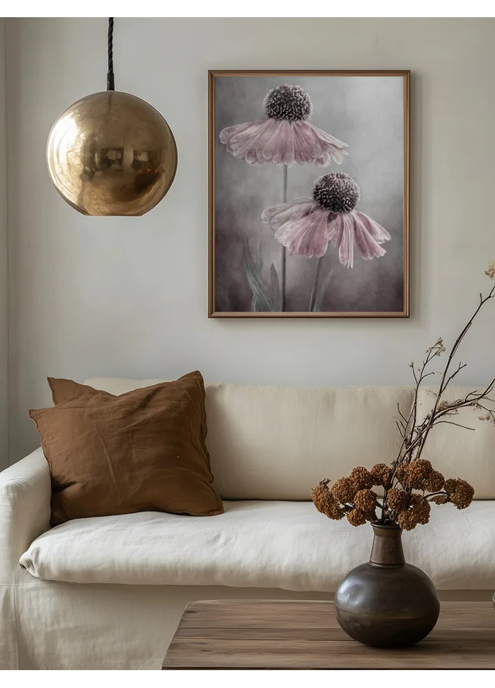 Denne kombination gør motivet særligt velegnet til rum, hvor man ønsker en behagelig og afslappet atmosfære – eksempelvis i stuen, hvor det fungerer som et elegant midtpunkt, eller i soveværelset, hvor de rolige toner understøtter en harmonisk stemning. Den minimalistiske komposition gør plakaten let at kombinere med andre natur- og blomsterfotografier, og den fungerer både alene og i en billedvæg.