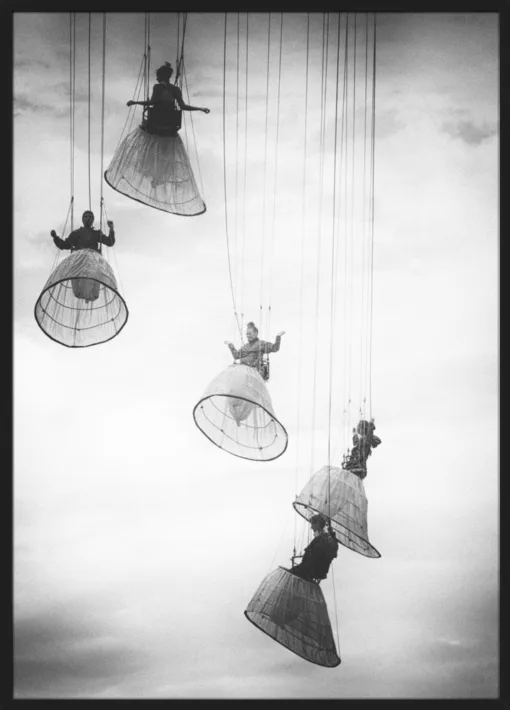 Et surrealistisk sort-hvidt fotografi af Julien Oncete, hvor kvinder i kjoler hænger som engle i himlen. Kontrasten mellem tyngde og lethed skaber et drømmende udtryk med kunstnerisk dybde. En plakat, der indbyder til fordybelse og passer smukt i stuen, soveværelset eller gallerivæggen.