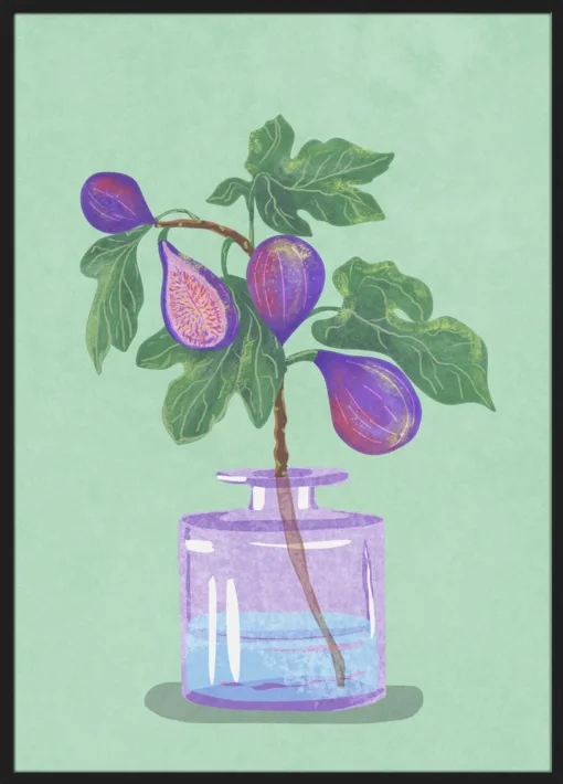 Smuk plakat med figengren i vase på grøn baggrund. Et botanisk motiv med elegant udtryk.