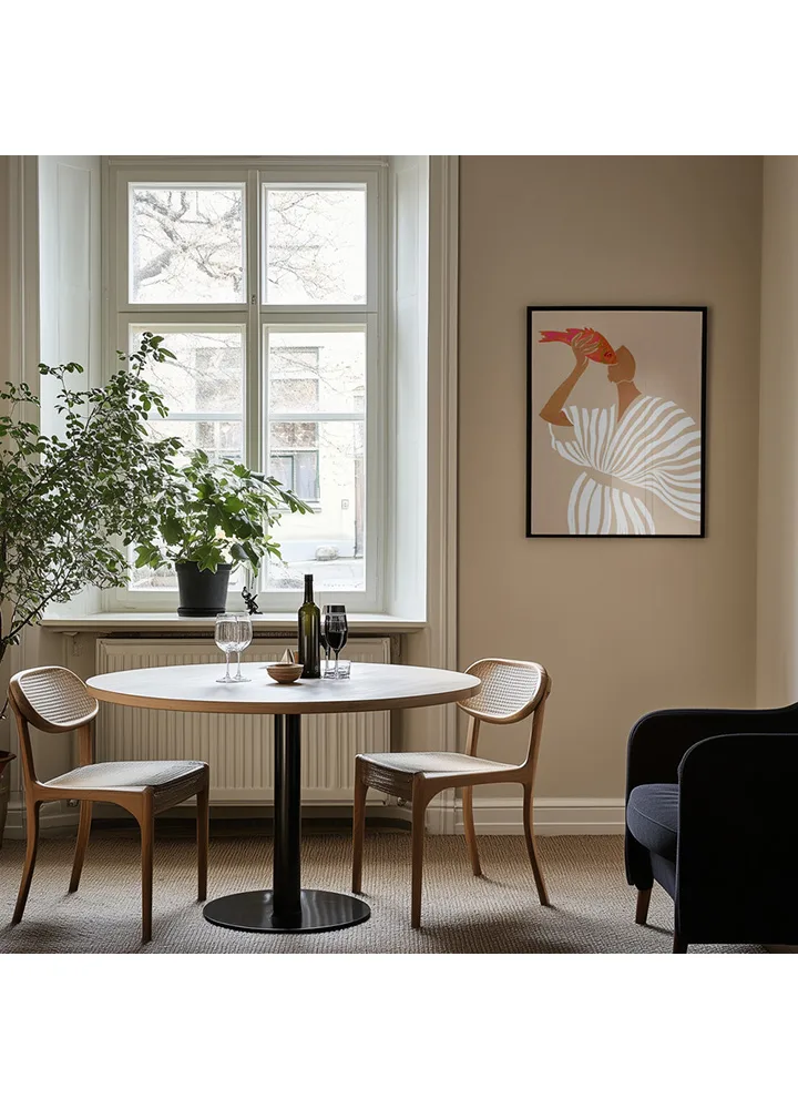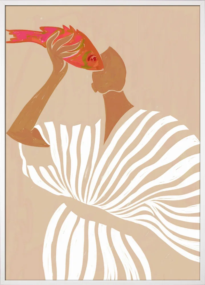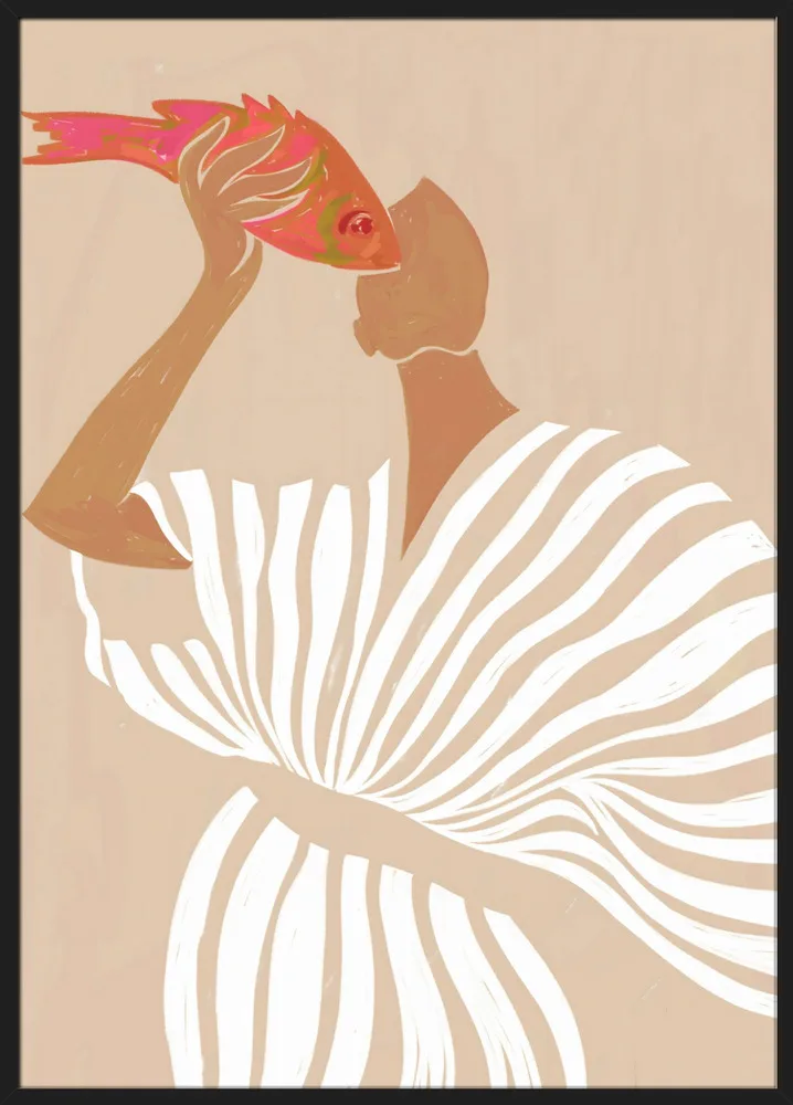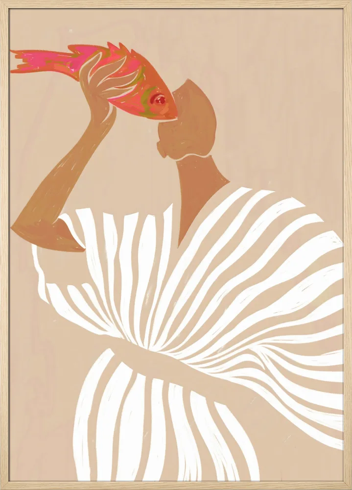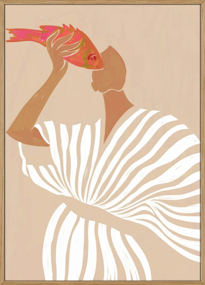 Elegant illustration af Uma Goghale med kvinde og fisk i varme beige og røde toner. Et drømmende og symbolsk motiv.