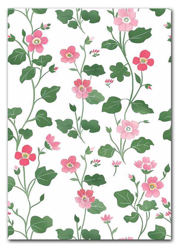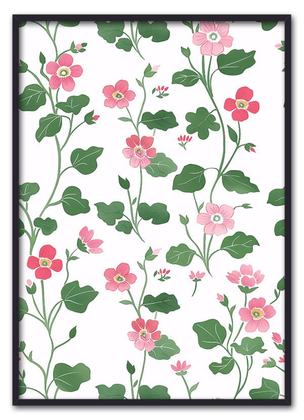 Floral Tapestry No. 01 er en dekorativ og let plakat med et mønster af pink blomster og grønne grene, der slynger sig på kryds og tværs. Motivet har et næsten tekstilagtigt udtryk og emmer af romantik og vintage-stemning. Den hvide baggrund lader farverne stå klart og giver luft til det florale motiv. Plakaten passer smukt i soveværelse, badeværelse eller i sommerhuset, hvor den skaber en let og blomstrende atmosfære. Den fungerer både alene og sammen med Floral Tapestry No. 02.