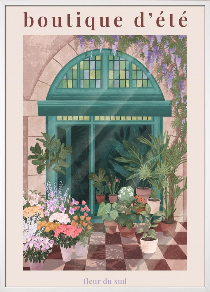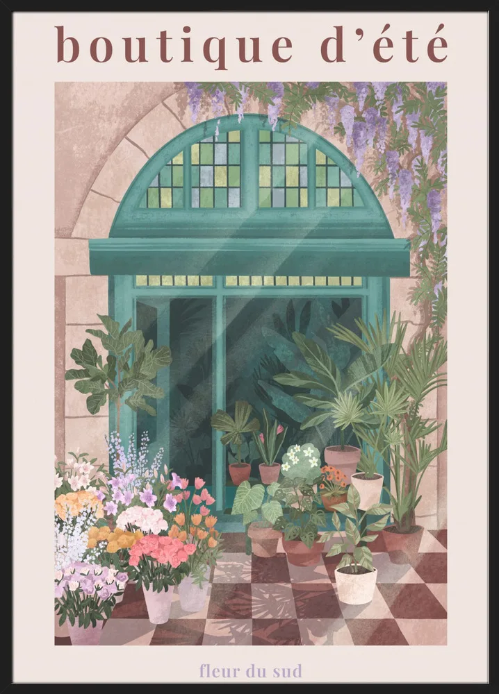 French Flowershop Poster af Goed Blauw er en atmosfærisk illustration, der indfanger følelsen af en sommerdag i en lille fransk by. Butikkens grønne buede vinduer, mønstrede gulvfliser og de mange planter skaber en rig og inviterende scene. Farvepaletten består af støvet grøn, rosa, beige og gyldne toner, som tilsammen giver motivet en drømmende og nostalgisk karakter. Stilarten er illustrativ med høj detaljeringsgrad, og motivet fungerer som et lille vindue til en botanisk og charmerende verden. Denne plakat passer perfekt i køkkenet, entreen eller stuen, hvor den tilfører både personlighed og varme. Den er oplagt til dem, der elsker botaniske motiver med et strejf af europæisk charme.