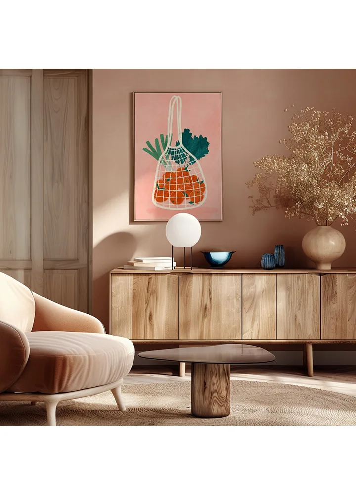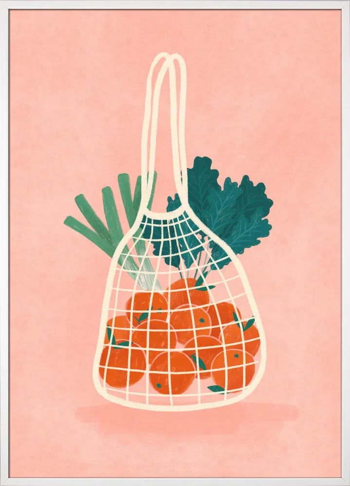 Fruit N Veg af Bea Müller er en charmerende hyldest til hverdagsmadens farver og former. Motivet viser appelsiner, gulerødder og grønne blade i et klassisk net, gengivet i hendes varme og moderne farveunivers. Den lyserøde baggrund skaber en blød kontrast til de orange og grønne nuancer, mens den simple komposition giver ro og balance. Bea Müllers stil kombinerer humor, grafiske former og farveglæde, hvilket gør dette motiv til et oplagt valg til køkkenet, spisestuen eller sommerhuset. Det fungerer også perfekt i en mad- eller køkkenrelateret billedvæg sammen med fx Lemon and Checks eller Papaya.