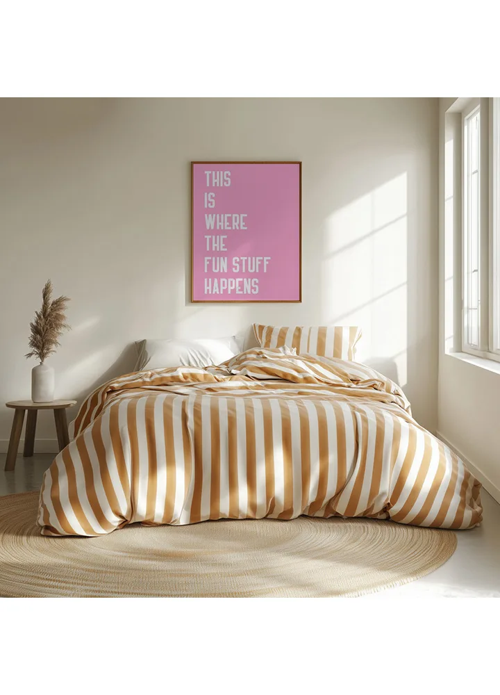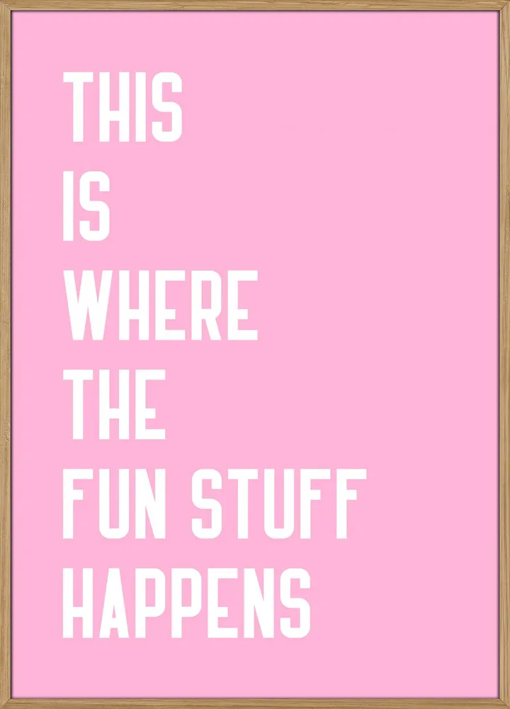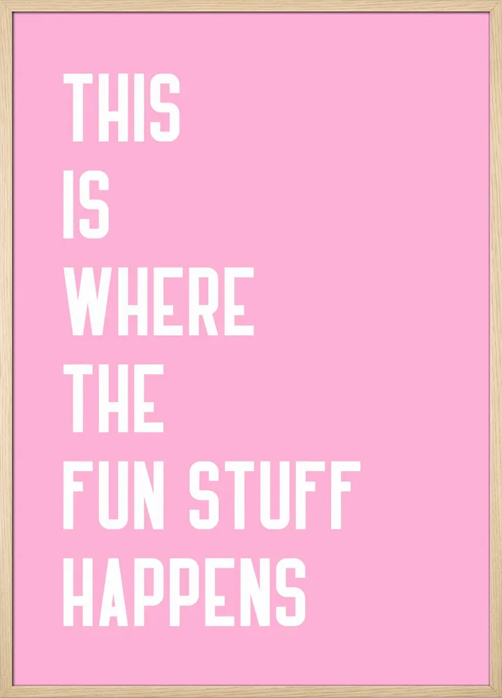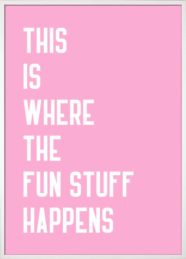 Frisk og energisk plakat i pink med hvid tekst: This is where the fun stuff happens. En moderne vægstatement med humor.