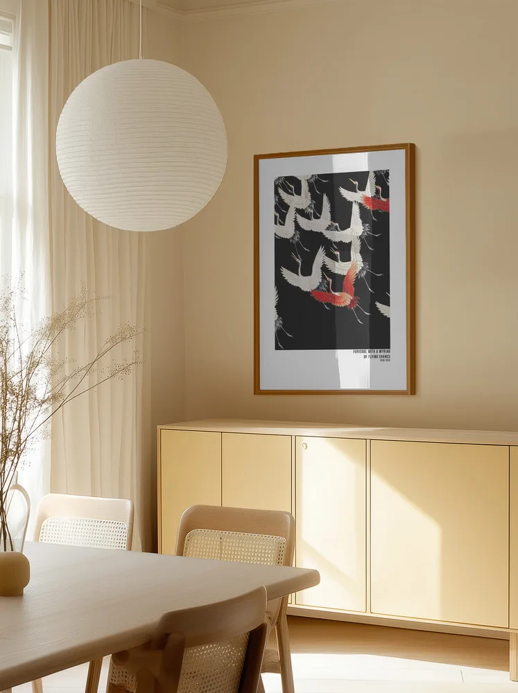 Elegant japansk vintageplakat med hvide traner på sort baggrund. Et klassisk symbol på lykke og lang levetid.