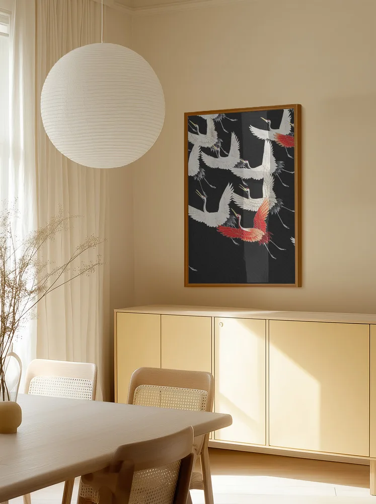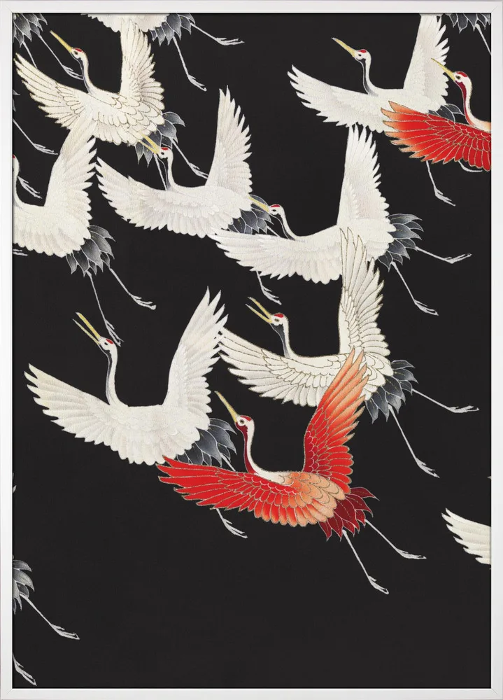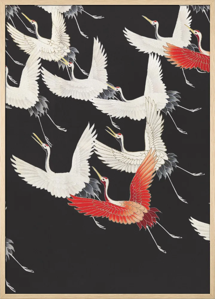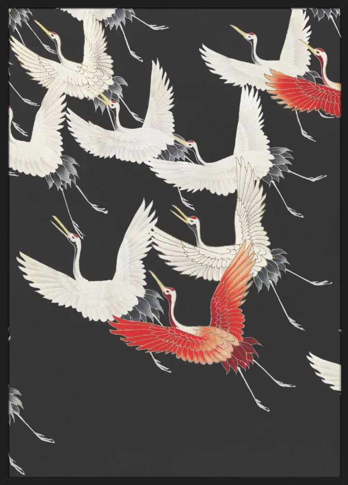 Furisode With a Myriad of Flying Cranes. Full er en komplet version af det klassiske trane-motiv fra tidlig 1900-tals japansk kunst. De elegante fugle er gengivet i bevægelse med stor præcision, og farvesammensætningen af sort, hvid og rød giver motivet et luksuriøst udtryk. Tranen er i japansk kultur et symbol på fred og langt liv. Plakaten bringer en følelse af lethed og æstetik til både stue og soveværelse.
