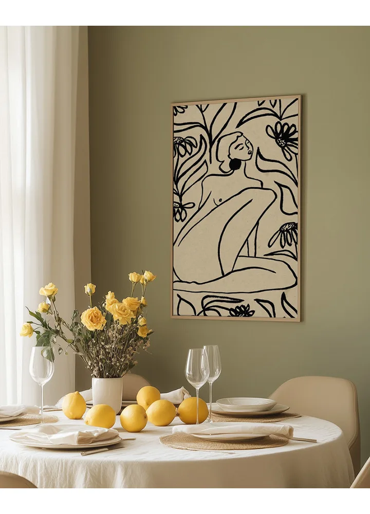 Sort-hvid linjetegning af kvinde i solsikkemark. Et stilrent og feminint motiv.
